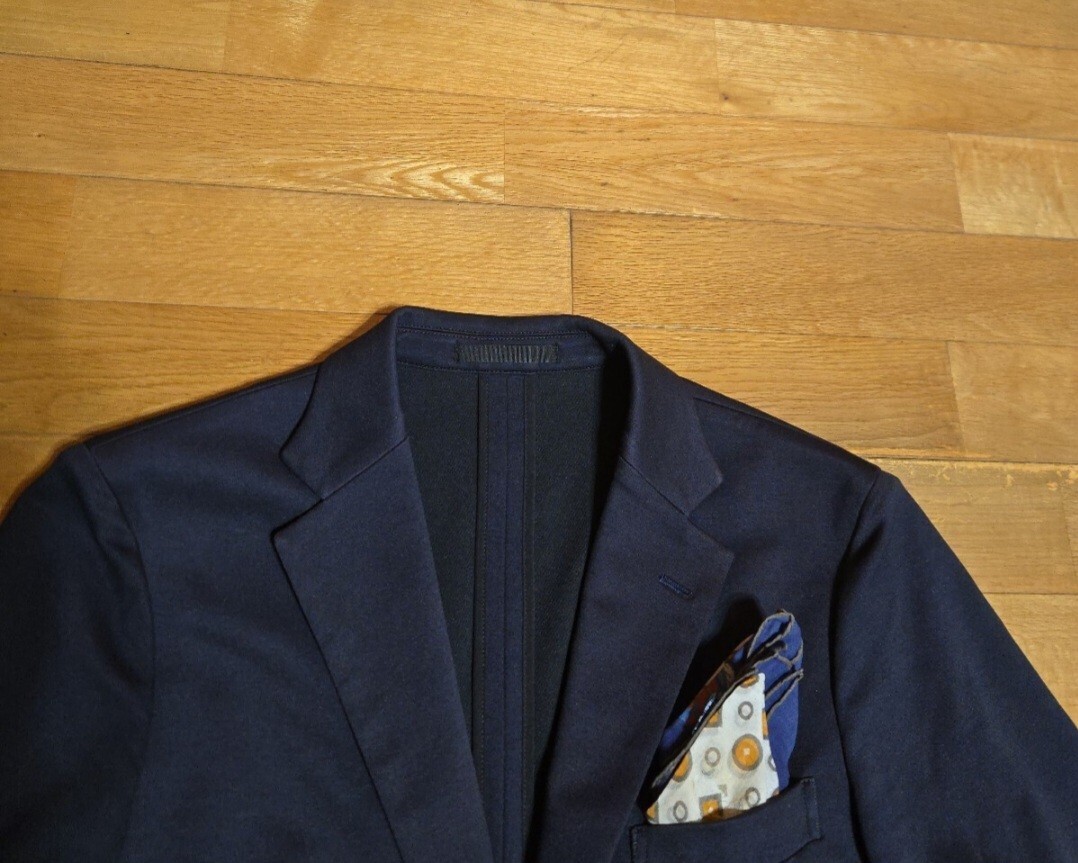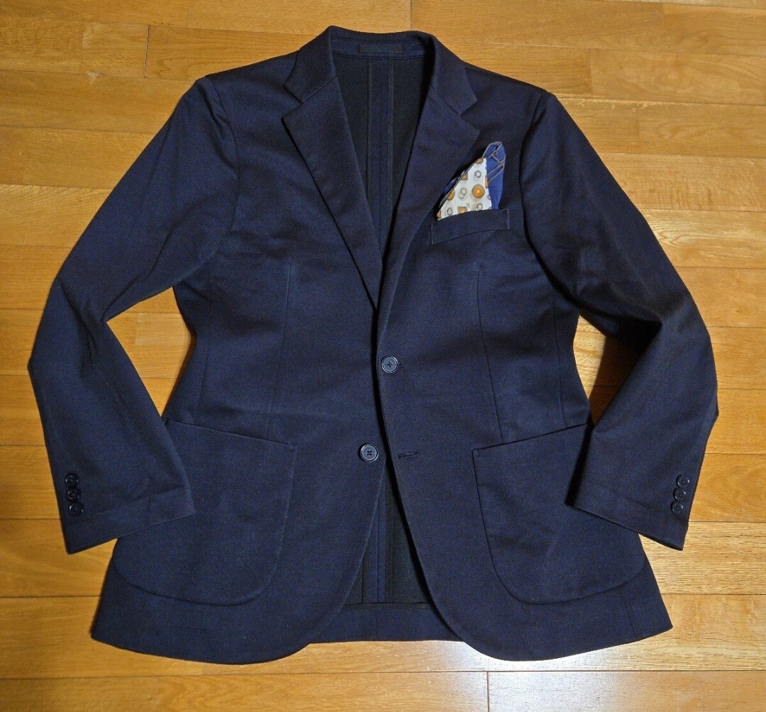佇まいが素晴らしい滑らかで快適な生地『上質マイクロポップサック調織りサキソニージャージー』のネイビー地、独特の質感と軽やかな英国的な通年生地が特徴的です、また裏地は半裏仕様の軽く羽織れます機能的なジャケット。シルエットは英国調の極上定評モデルの美シルエット、特別なジャージー生地を使用した極上の質感と洗練された雰囲気がある英国調テーラードジャケットです。