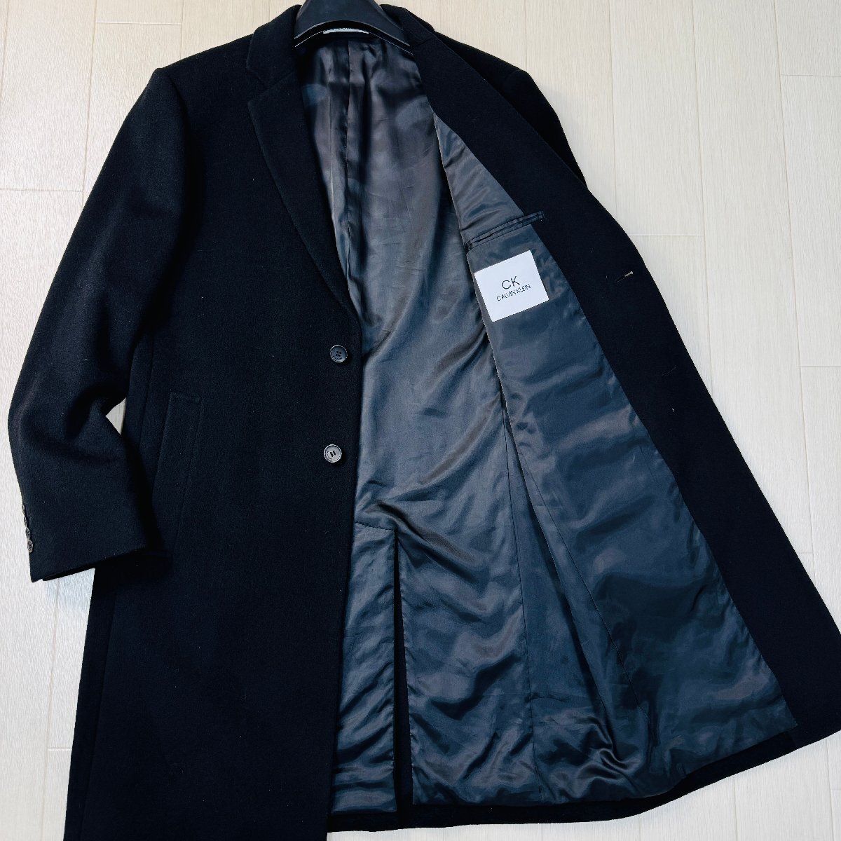 美品/40 XL相当★カルバンクライン Calvin Klein メルトン生地 ウールコート チェスターコート ジャケット アウター 厚手起毛 メンズ 黒