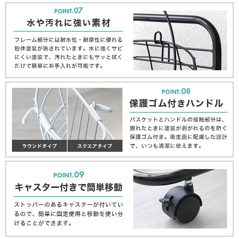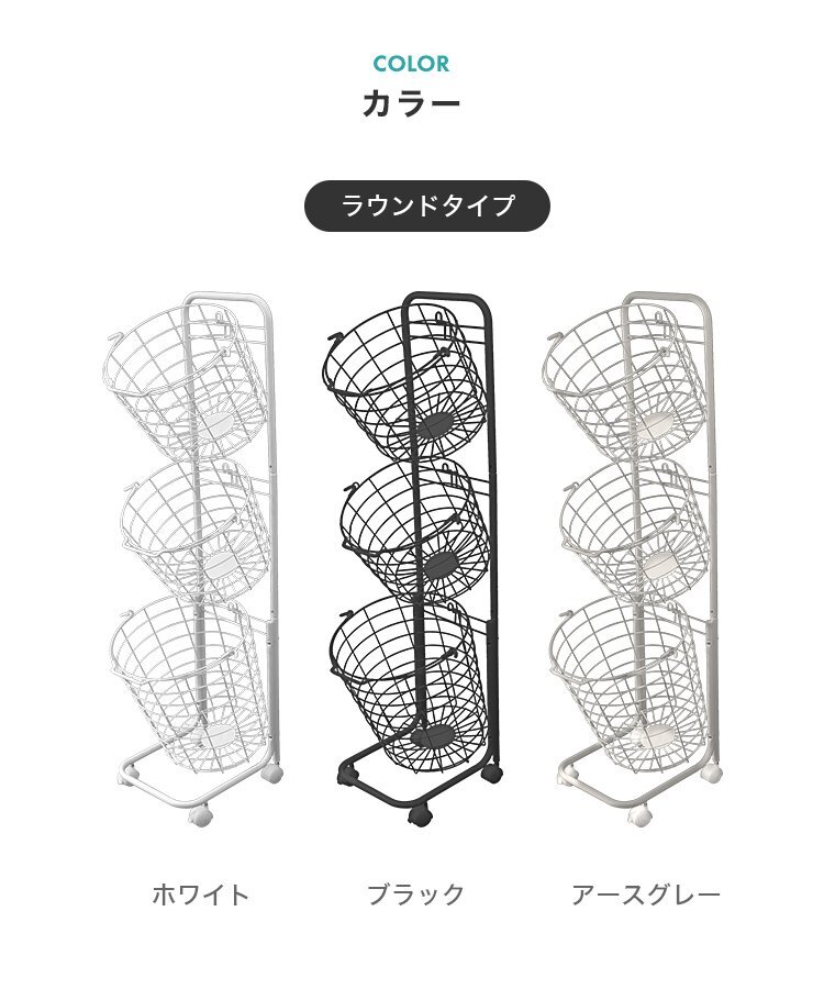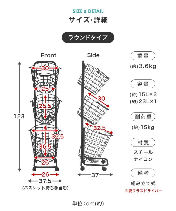 こちらの商品は幅約37cmのバスケットを3つ縦に並べることが可能。 デッドスペースを活用することで物が多くなりがちな洗濯機まわりも無駄なくすっきり。 狭くなりがちなスペースを有効に活用することができます。 3つのバスケットは取り外しも可能で、持ち手があるのでベランダに運ぶ時なども便利にお使いいただけます。 キャスター付きで、ラックごとの移動もスムーズです。 ランドリー以外にキッチンの食品ストッカー、リビングの雑貨入れ、おもちゃ収納も使えます! 【商品仕様】 ・カラー:ホワイト(ラウンド型) ・サイズ:(約)幅37.5×奥行き37×高さ123cm ・バスケット内寸 小:(約)幅30×奥行き30×高さ25.5cm 大:(約)幅32.5×奥行き32.5×高さ36.5cm ・重量:(約)3.6kg ・容量:(約)53L(小15L×2、大23L) ・バスケット耐荷重:(約)15kg ・素材:スチール(粉体塗装)、他 【注意事項】 ・お客様組み立てになります。(プラスドライバーはお客様でご準備ください。) ・スチール製の為、浴室ではご使用いただけません。 |