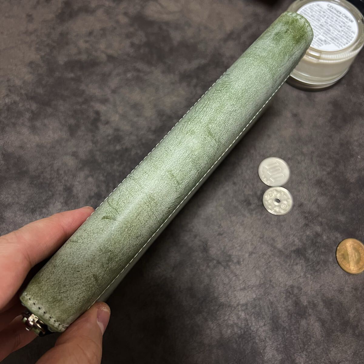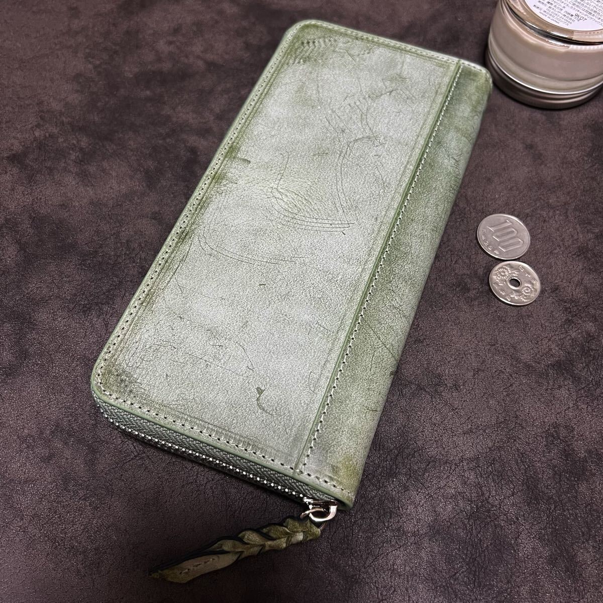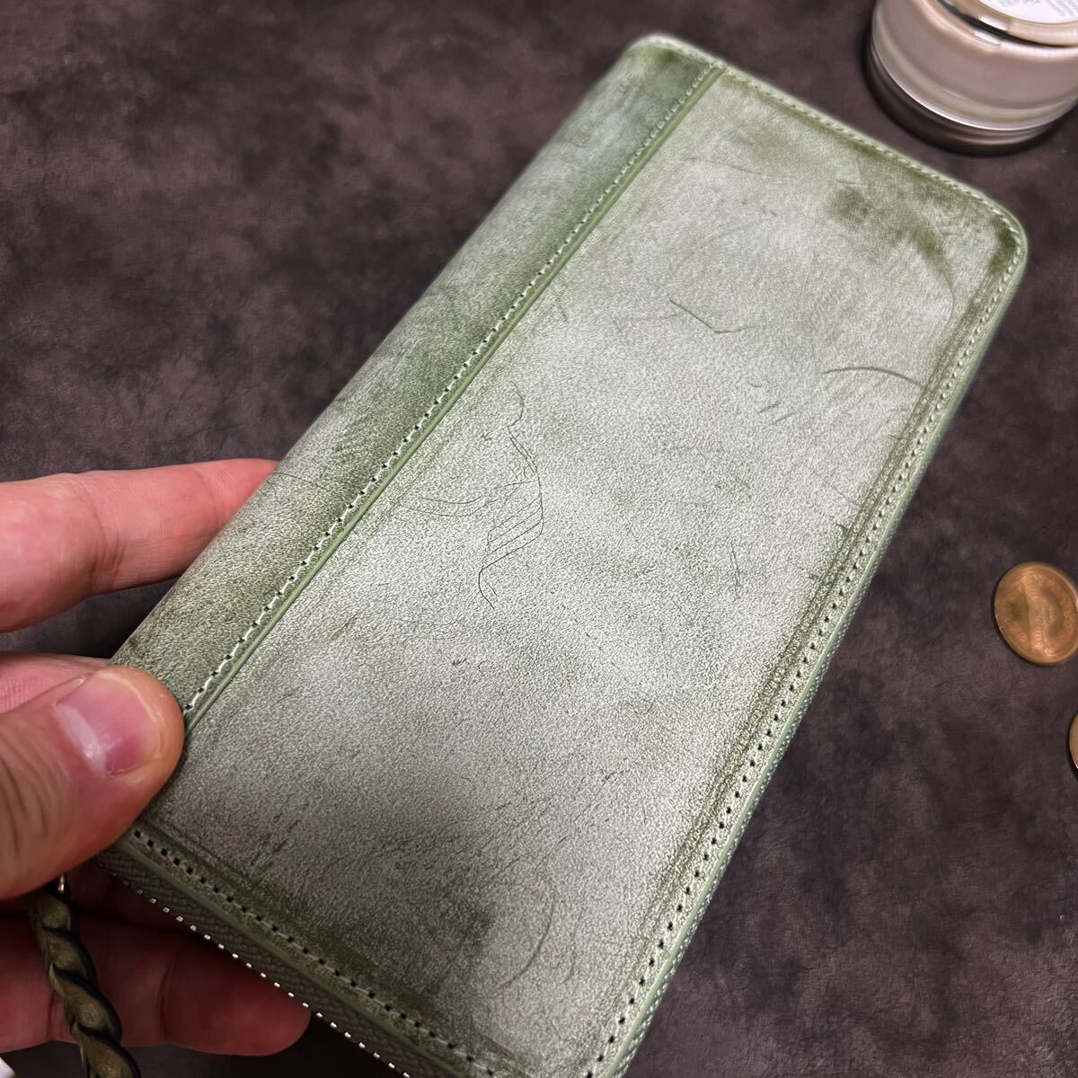 ※浮かび上がるロウにムラがあることや、縫い糸付近のミシン跡は、革に手を加えていない証拠です。