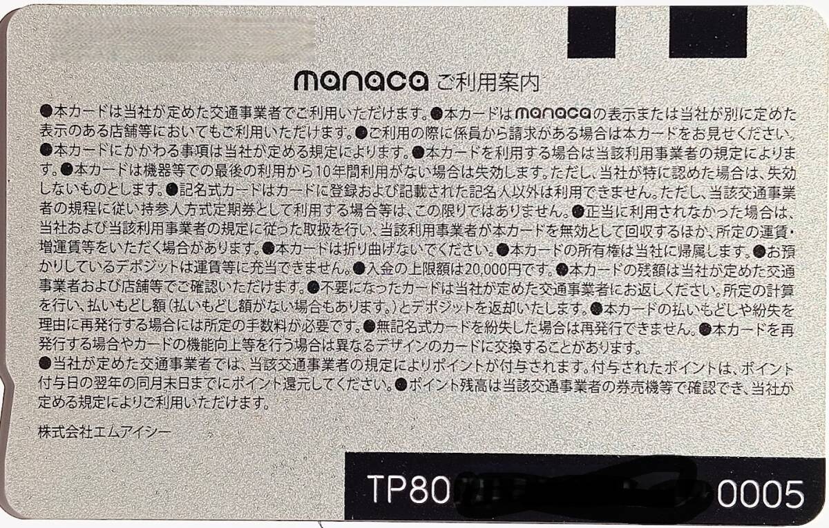 | 名古屋鉄道のICカード manaca。落札者様でチャージ(入金)の うえ使用可能。新規購入後は写真のようにOPP袋に入れて、1回タッチで 残高を0円にしています。傷はついていないと思われます。 全国の交通系ICカードの相互利用カードです。カード番号の下4桁が 0005です。 |