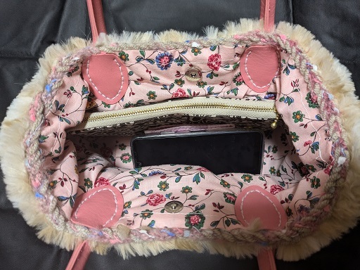 裏地は綿生地を利用しマグネットも付けております。長財布、スマホ、ハンカチ入れてまだ余裕があります。