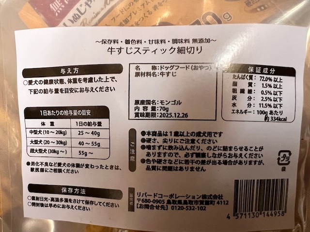 | ●70g×20袋セット♪ リバード 無添加ピュア いぬじゃーきー 牛すじスティック細切り |