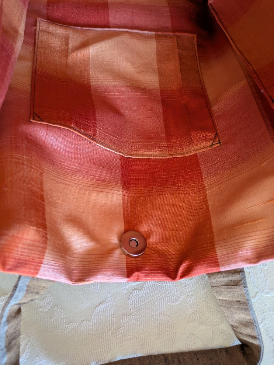 中布は紬の着物生地を使用。入れ口はマグネットボタン留めになっています。