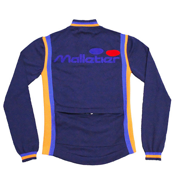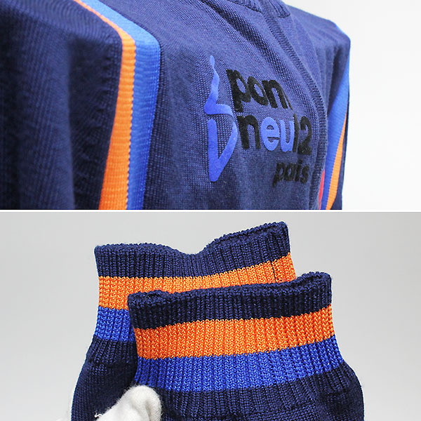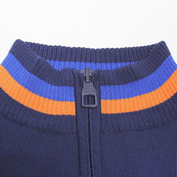 深みのあるネイビーをベースにオレンジやアイボリーなどのカラーが映えるデザインのハーフジッププルオーバーです。