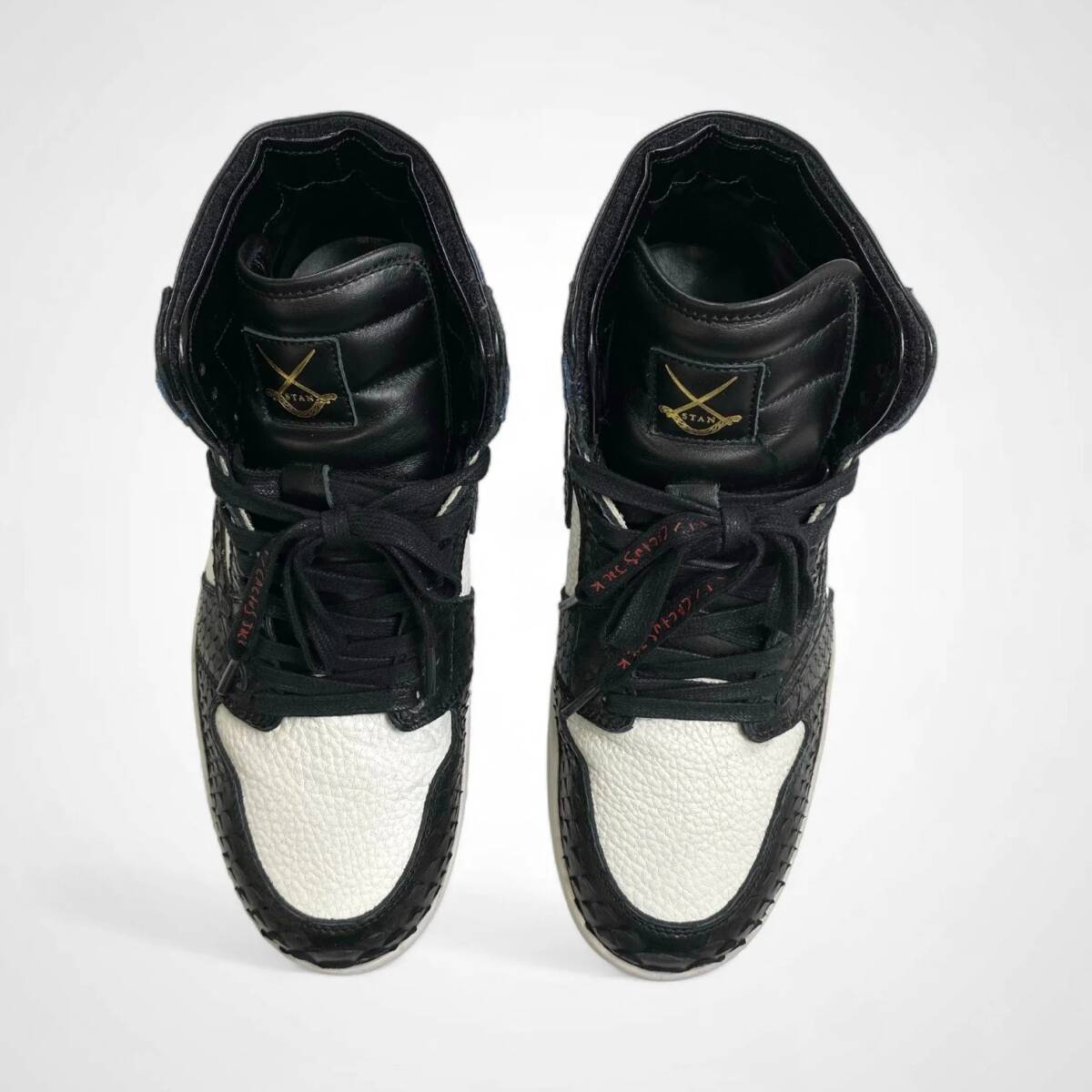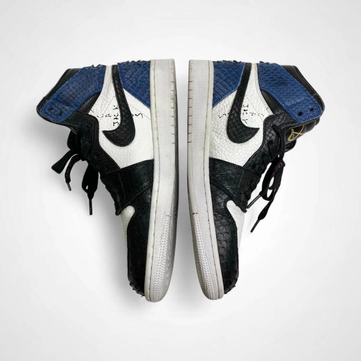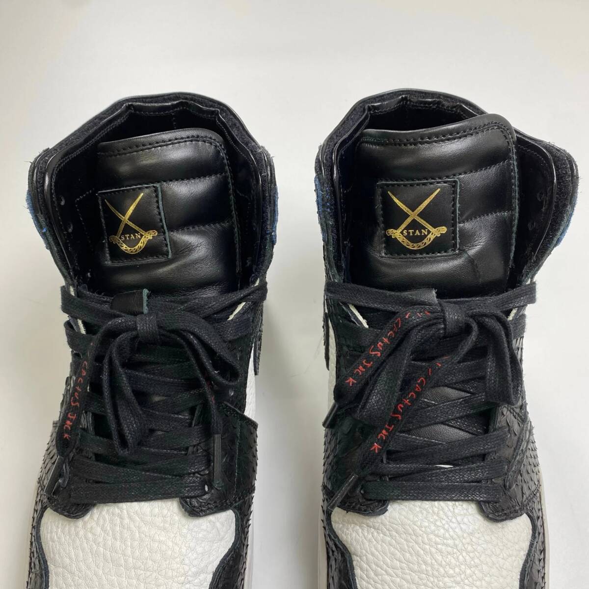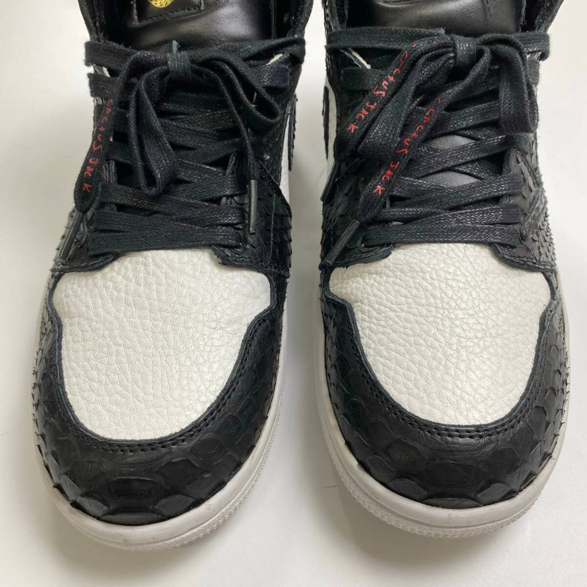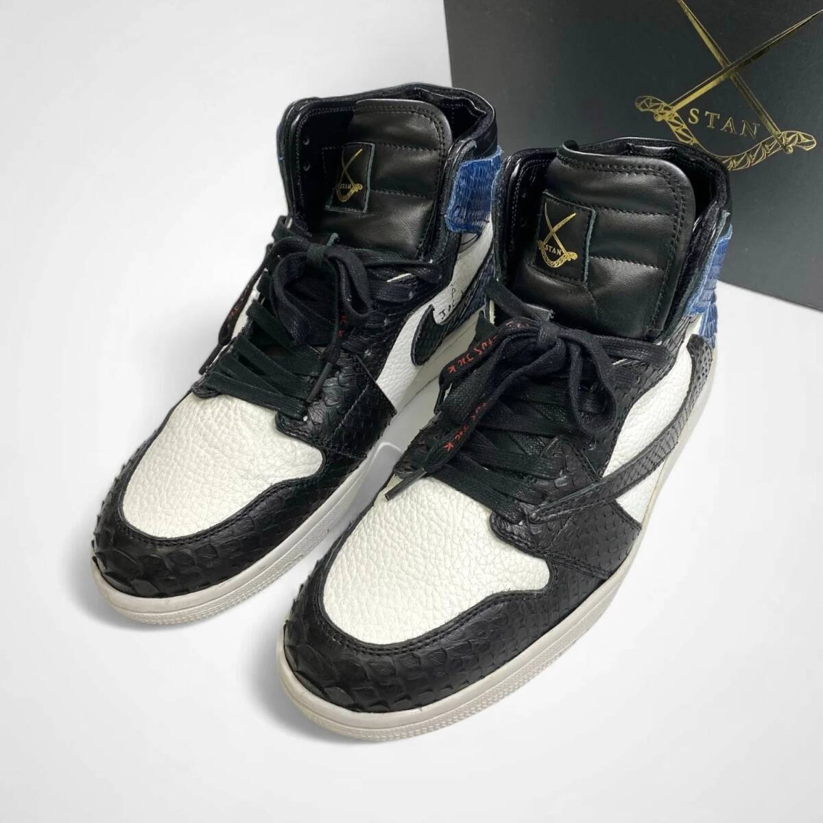 東京、ニューヨークを拠点としたラグジュアリーカスタムフットウェアレーベルのクリエイタースタジオ「STAN」。 新しい価値を組み込んだユニークなデザインと最高峰の技術によりアレンジ。 最上級なラグジュアリー素材を採用し、全てのスニーカー をハンドメイドで展開しています。 こちらはNIKE AJ1のTravis Scottモデルをベースに、レザーをアップグレード。パーツはパイソンでカスタムした一品。 アッパーも上質で柔軟性のあるシボ革を採用。シュータンは履口周りは、より光沢感がありハリのあるレザーを使用しております。 使用感少なく極美品。まだまだご着用いただけるコンディションです。