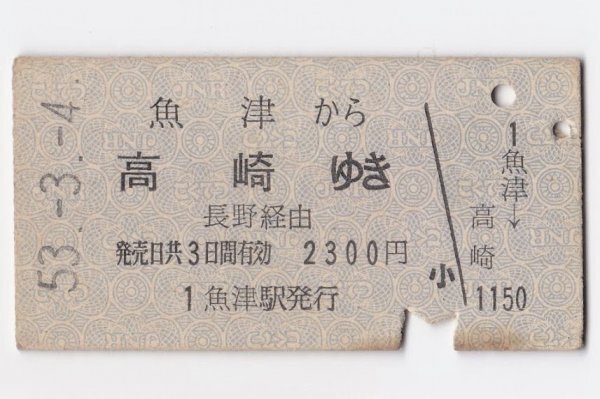 ●国鉄●【 魚津から高崎ゆき 長野経由 2300円 】A型券 昭和53年 北陸本線 魚津駅発行【0299】
