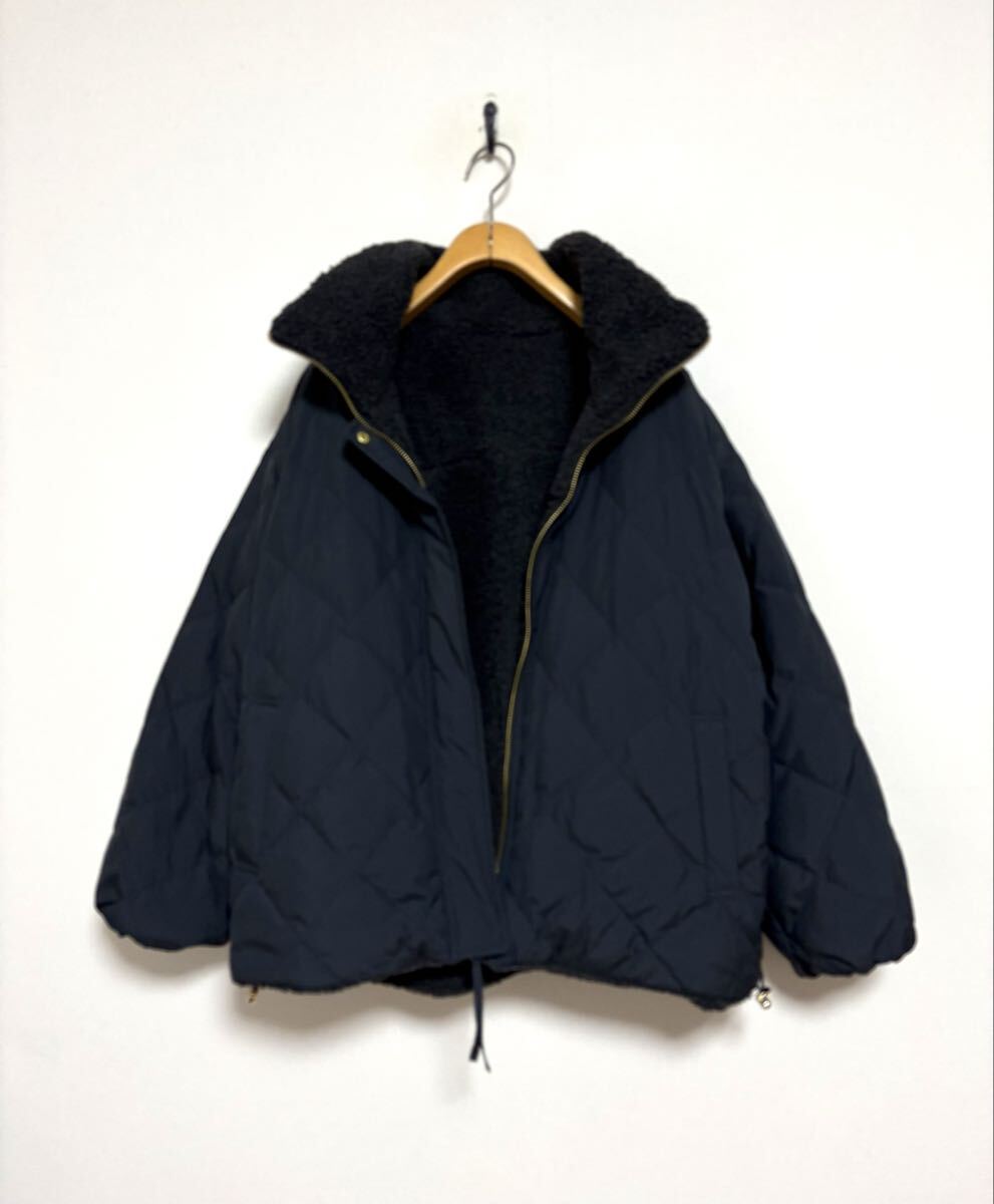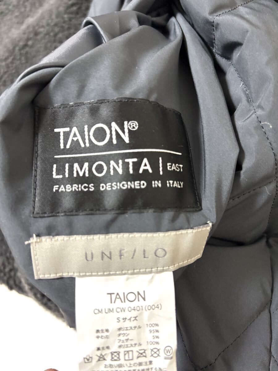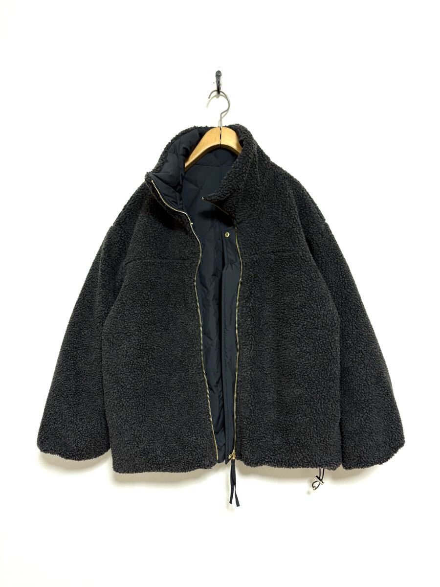 「TAION×UNFILO」のダウンボアブルゾンです。サイズ…S(身幅約65cm、着丈約66cm)。素材・・・表地、裏地とのポリエステル100%。中綿・ダウン95%、フェザー5%。カラー・・・ボア・チャコールグレー×キルティング・墨黒(チャコールグレーに近い黒)。定価・・・22990円。インナーダウンブランド「TAION」と「UNFILO」のコラボブルゾンです。表面はボア、裏面はキルティングデザインのタフタ素材と、異なる印象を楽しめます。