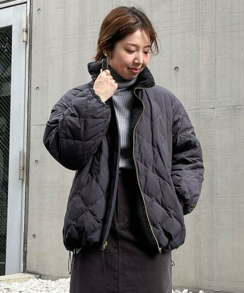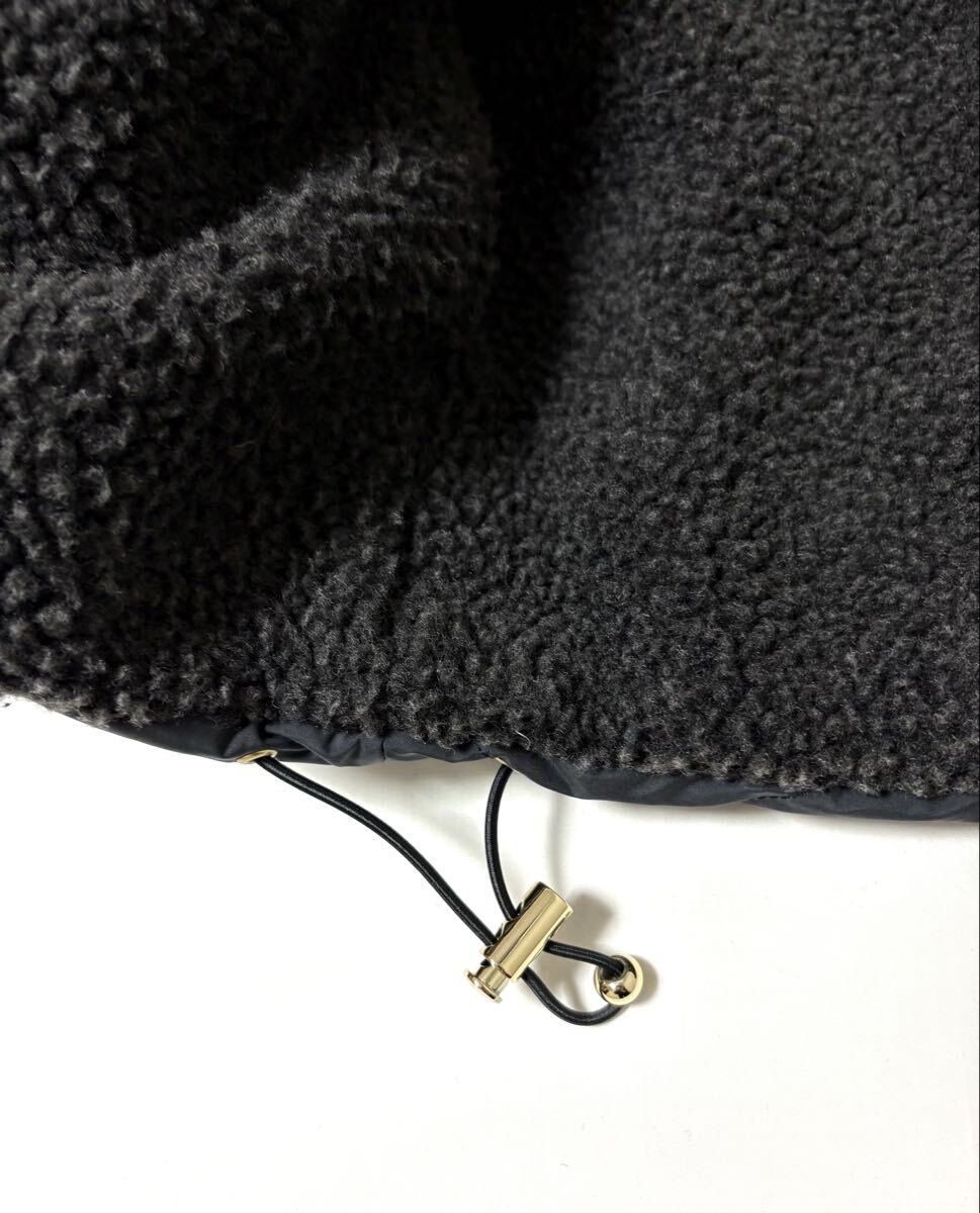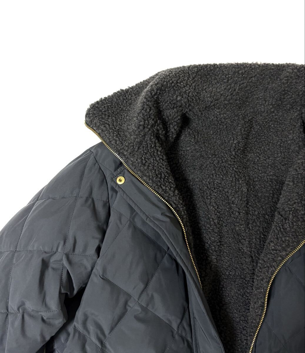 「TAION×UNFILO」のダウンボアブルゾンです。サイズ…S(身幅約65cm、着丈約66cm)。素材・・・表地、裏地とのポリエステル100%。中綿・ダウン95%、フェザー5%。カラー・・・ボア・チャコールグレー×キルティング・墨黒(チャコールグレーに近い黒)。定価・・・22990円。インナーダウンブランド「TAION」と「UNFILO」のコラボブルゾンです。表面はボア、裏面はキルティングデザインのタフタ素材と、異なる印象を楽しめます。