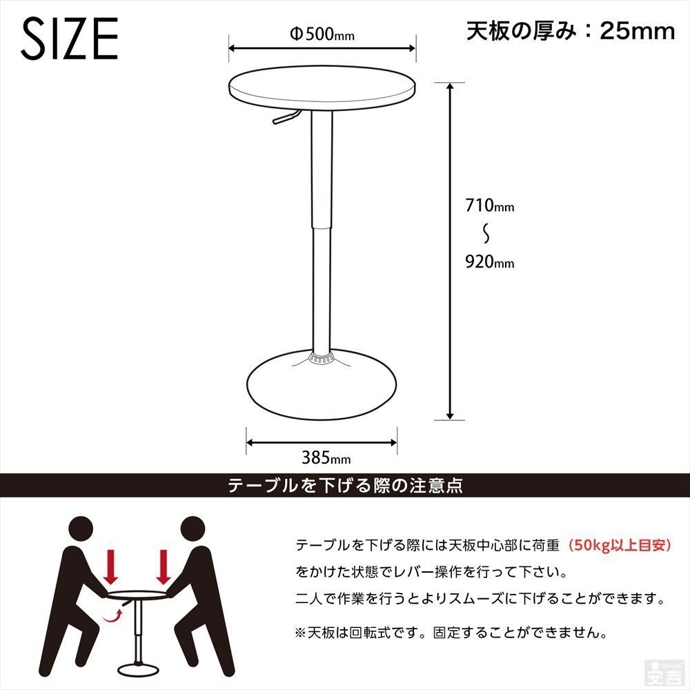 | 特長 | ・テーブルは360度回転します。 ・テーブル下のレバーで高さを調整できます。 ・バーやカフェのテーブル、休憩室や喫煙室のテーブルにも最適です。 ・昇降式なので座ってでも立ってでも利用できるテーブルです。 |