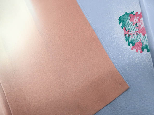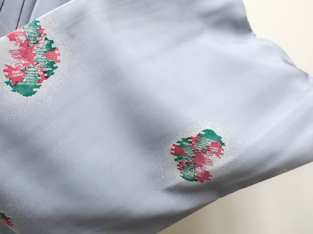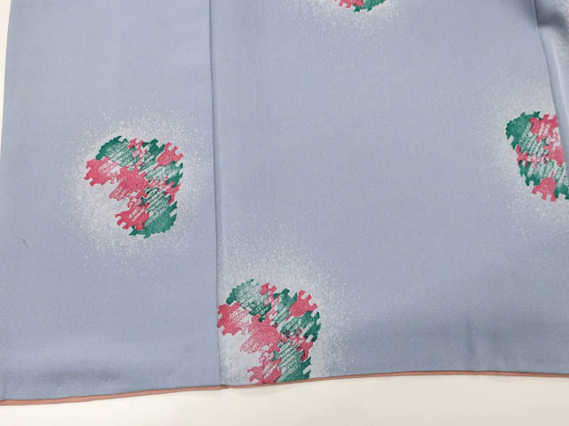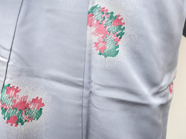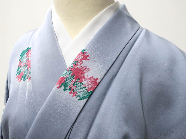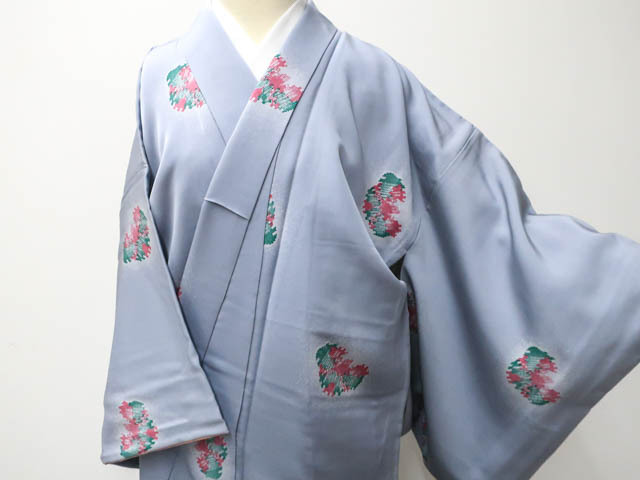 リサイクル商品のため、衿汚れ、左右前袖に薄汚れがございますがご着用いただけると存じます。 地色は薄灰青です。 1枚目の画像が近いお色かと思われます。 素材は正絹です。 |