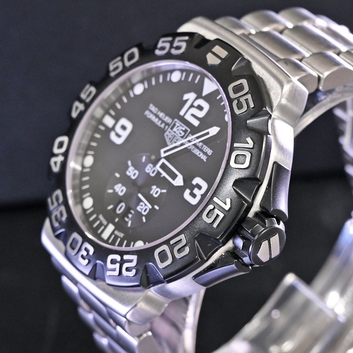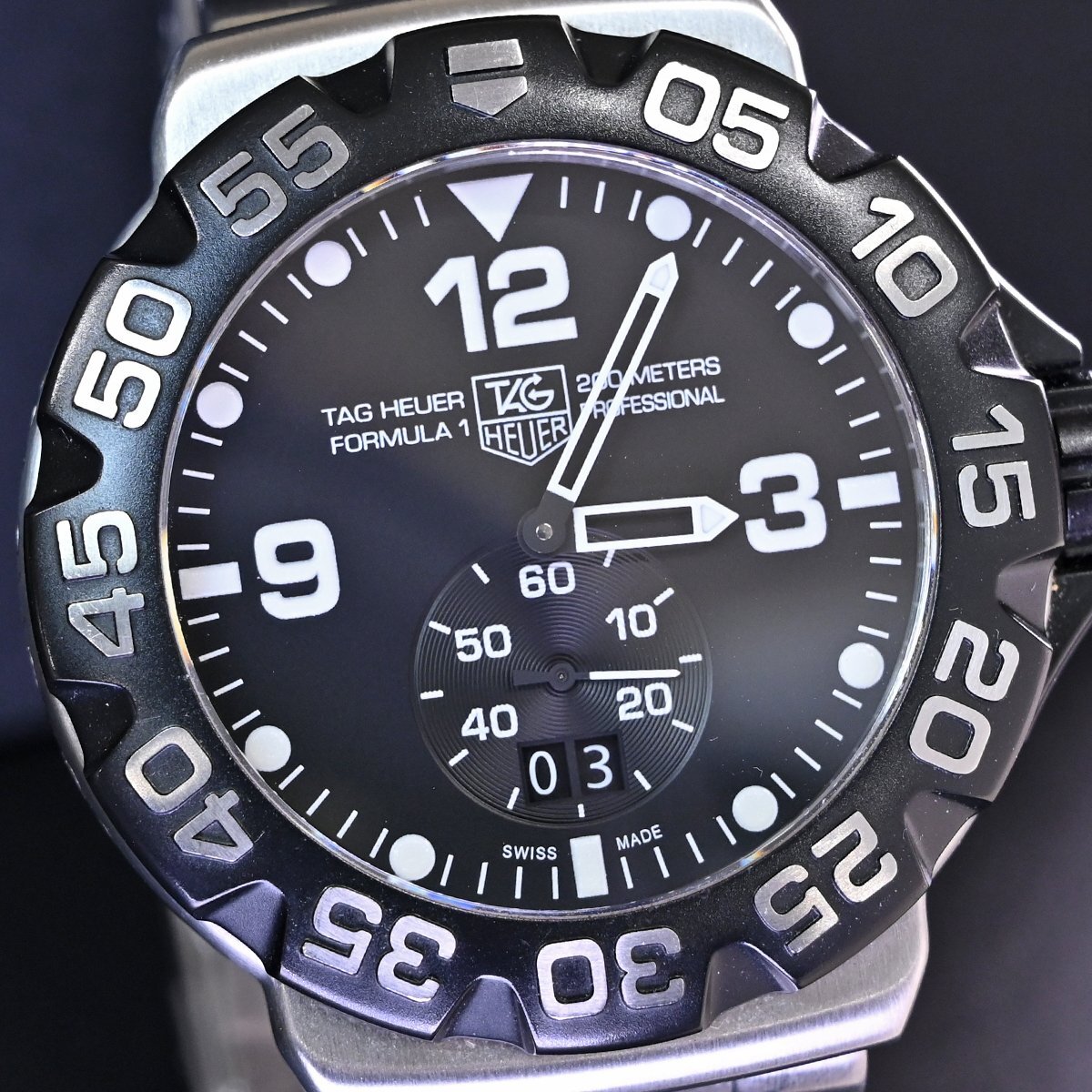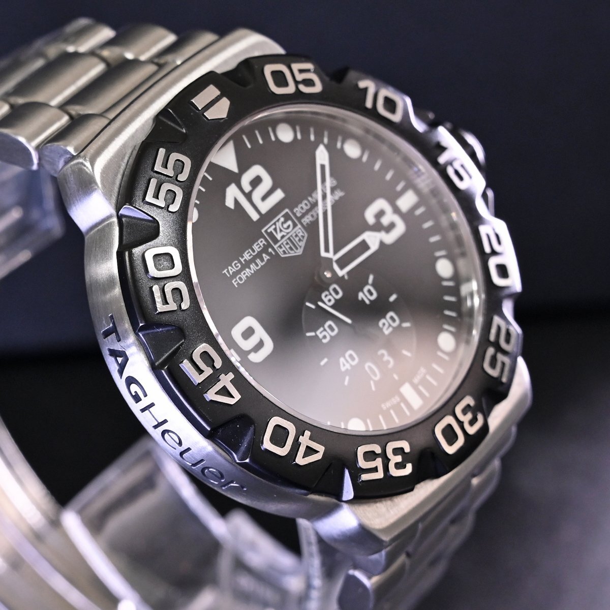 タグ・ホイヤーのグランデイト フォーミュラ1です。 メゾンのコレクションの中でもっともスポーティなモデルが「フォーミュラ1」。 F1をモチーフとしたこちらのモデルはダイヤルの6時位置に大型のスモールセコンドとグランデイトが装備された逸品。 ケースはサテン仕上げのステンレススティール製で、ベゼルにはブラックチタニウム カーバイド コーティングが施され、より精悍な印象を与えてくれます。 ケースバックにはチェッカーフラッグがレリーフされ、F1気分を盛り上げてくれます。 市場でも圧倒的な人気を誇るメゾンのお品なのでお探しの方も非常に多いかと思います。 ※基本動作確認済。 |