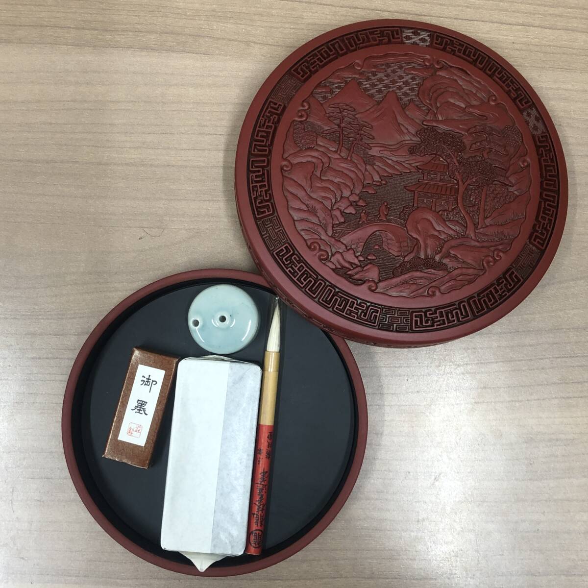 ●【書道具 おまとめ】那智黒石 熊野 三重県 中国 レリーフ 風景 書道印象二段セット★