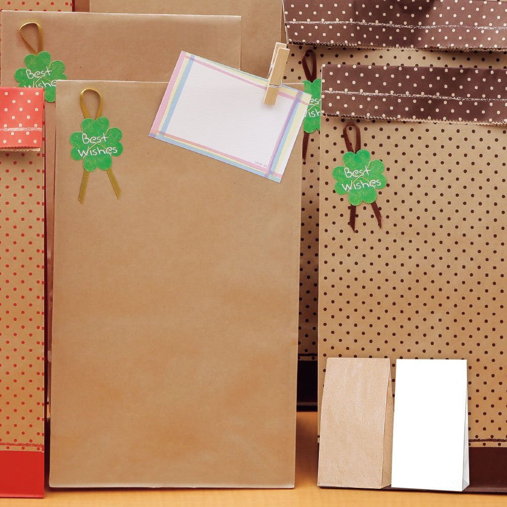 サイズや柄などを豊富に取り揃えたシモジマの紙袋。 その中でも持ち手のないシンプルな袋タイプの角底袋は使い勝手の良い人気商品です。 マチがついた袋ですので、焼き菓子やパンなどを取り扱うお店での使用におすすめな他、薬局や雑貨店などで個別包装の商品を入れるのにも便利です。 クラフト紙特有のナチュラルな雰囲気を活かし、シールやリボン、レースなどでラッピングしてギフトバッグとしてのご使用も素敵。 お店でのご使用の他、学校や職場、イベントや催事、地域の集まりなどの場で、お土産を入れる袋などにも。 シンプルな角底袋は工夫次第で様々な使い方を楽しんでいただけます。