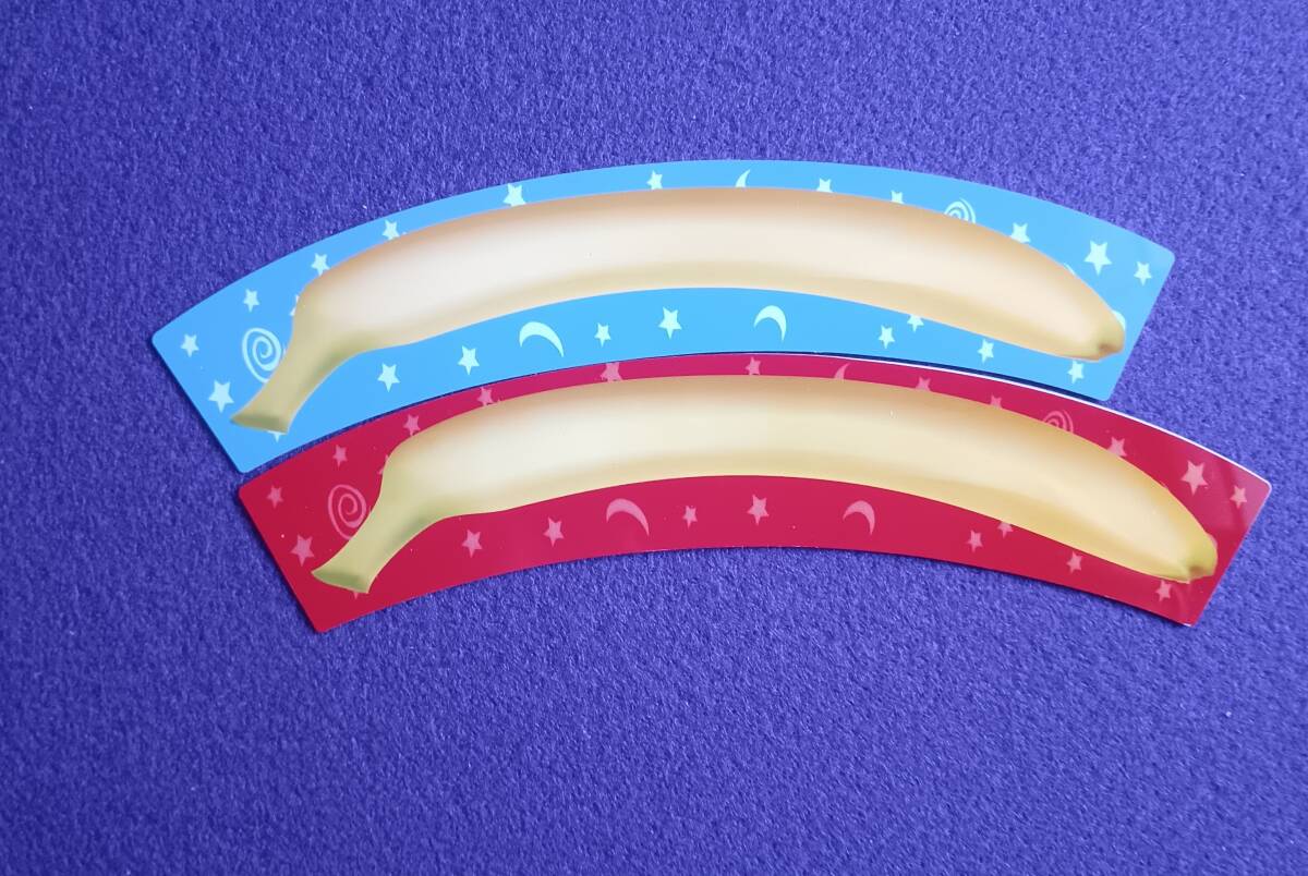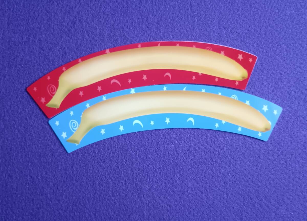 ★赤色バナナプレートと青色バナナプレートが伸びたり縮んだりする?演じ方はとても簡単で2枚のプレートを重ね同じ長さである事を示します