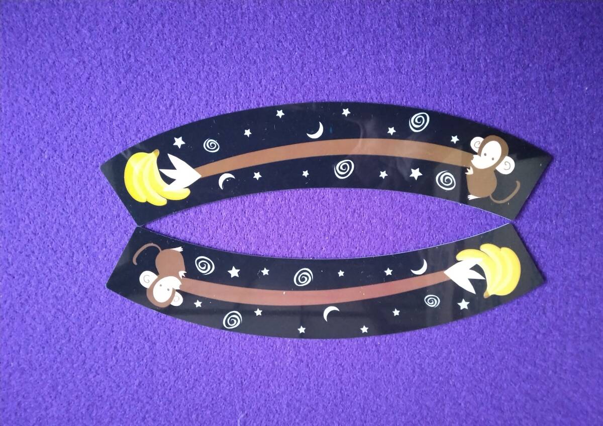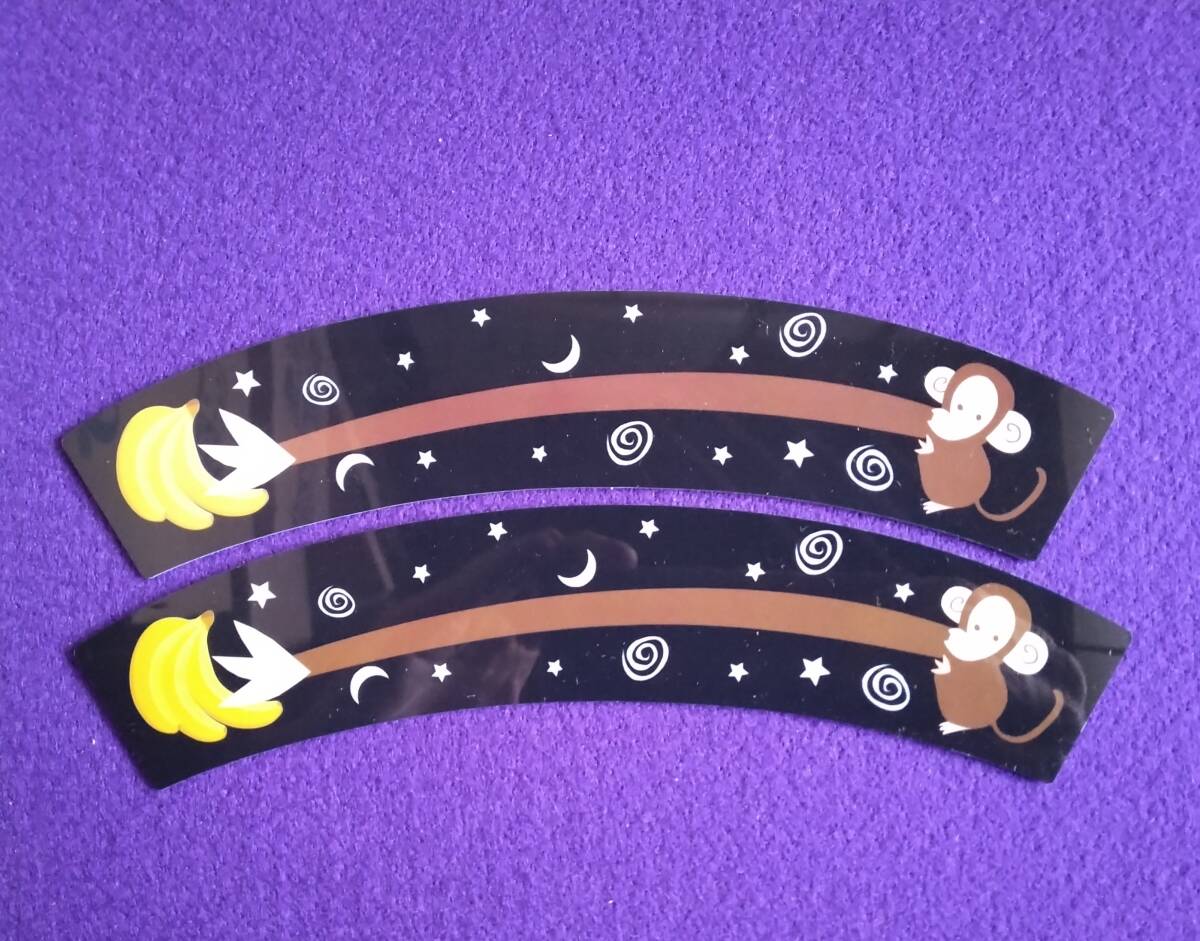 ★画像の片面はおさるさんがバナナに手を伸ばしている図柄もう片面は赤色と青色のプレートにバナナが描かれています