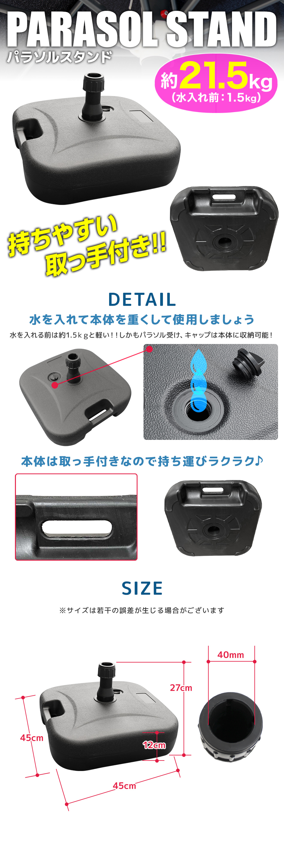 | パラソルベース 21kg 中に水を入れて使用するパラソルベーススタンド。 ガーデンやベランダでのパラソルの使用でオススメ! 使用後は中の水を抜けば軽くなるので持ち運びにも便利です。 本体は取っ手付きなので持ち運びがラクラク! ポール受けキャップは本体に収納できます。 パラソルスタンド以外にも、のぼり等のスタンドに最適! |