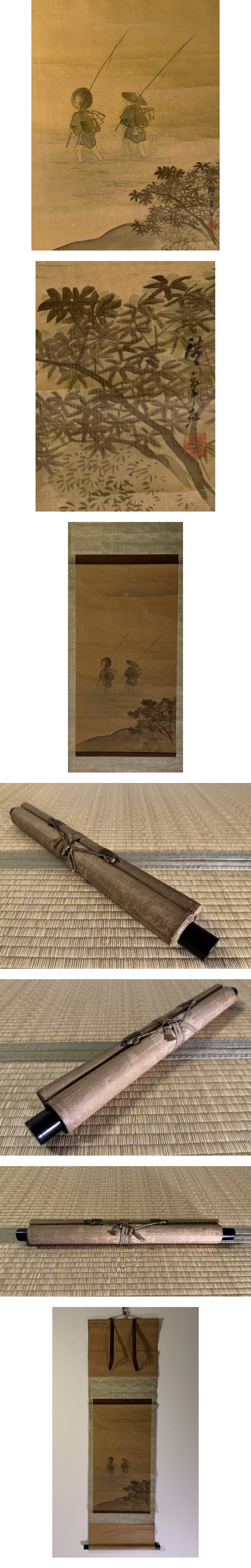 歌川広重(読み)ウタガワヒロシゲ [1797~1858]江戸後期の浮世絵師。江戸の人。本姓、安藤。歌川豊広に師事。広重の名を与えられ、一遊斎・一幽斎などと号した。叙情性と親しみやすさに富んだ風景画にすぐれ、代表作の「東海道五十三次」をはじめ、諸国風景や江戸名所を多数描いた。 表装 約126㎝ ×約37㎝ 本紙 約59㎝ ×32㎝ 箱無・シワあり。 【模写】 江戸期 浮世絵師 歌川広重 漁夫 絹本 掛軸 江戸出身 / 歌川豊広師事 |