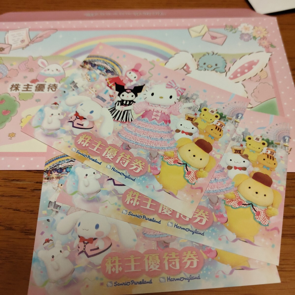 サンリオの株主優待券3枚です。サンリオピューロランド等で利用できます。有効期限は2026年8月31日です。