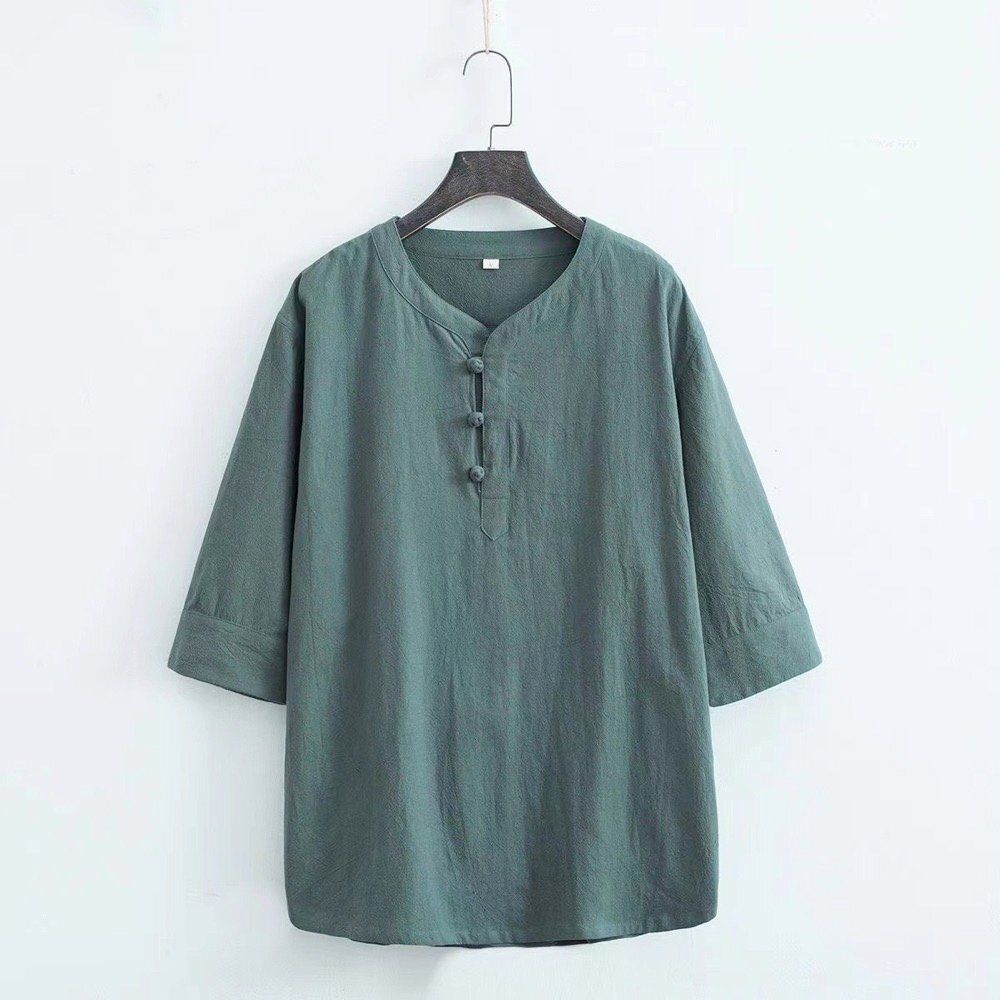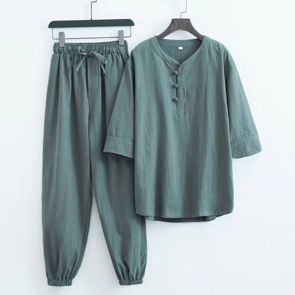 メンズ上下2点セット セットアップ ロングパンツ 綿麻 接触冷感 半袖シャツ チノパン 大きいサイズ ルームウェア 部屋着 グリーン M