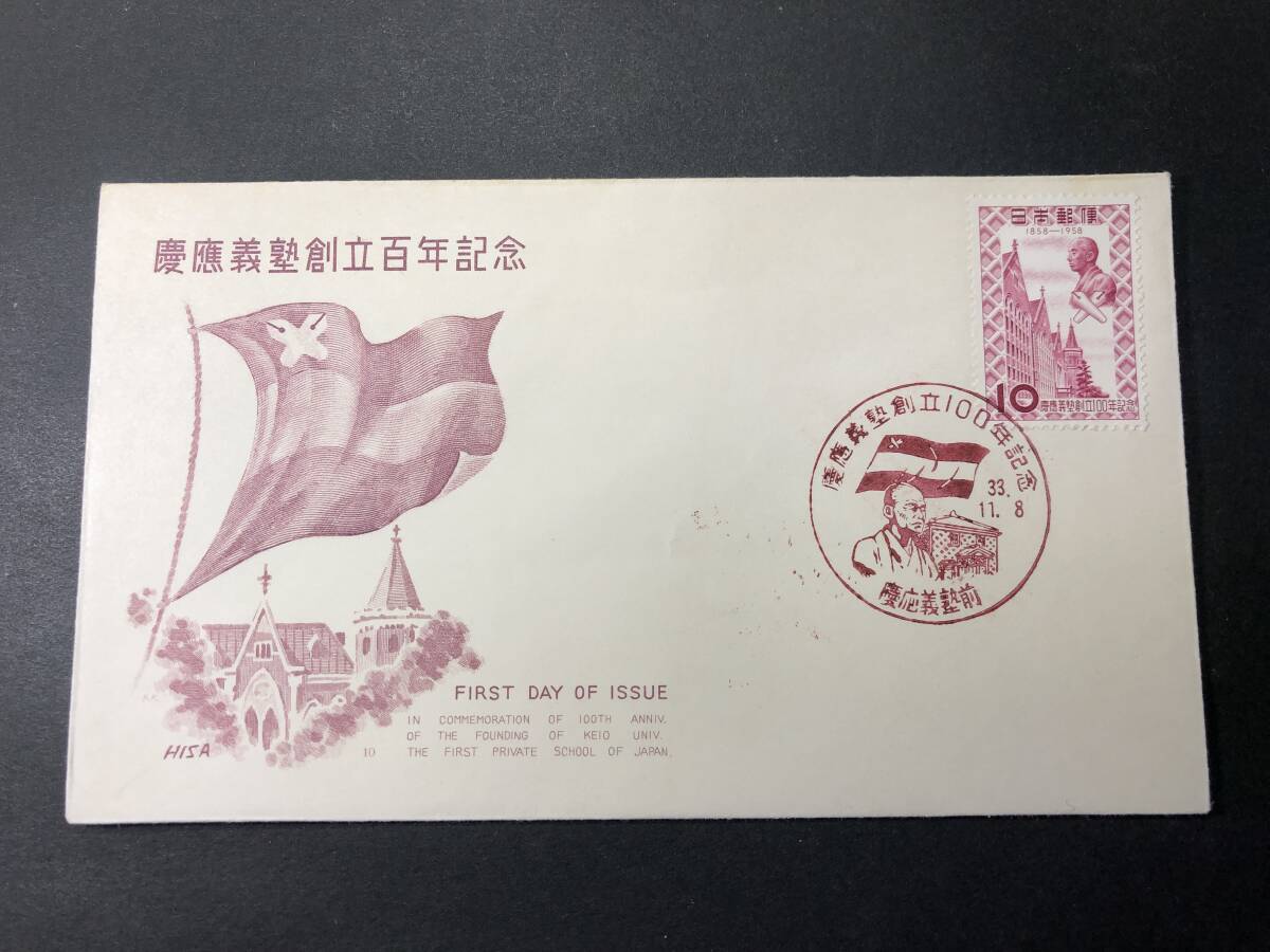 ★FDC 初日カバー★慶應義塾創立百年(100年)記念 「校舎と福沢諭吉」 印刷局凹版 昭和33年発行 Y9688
