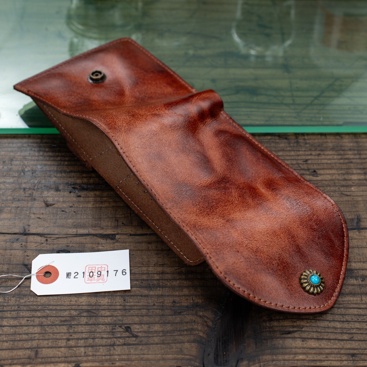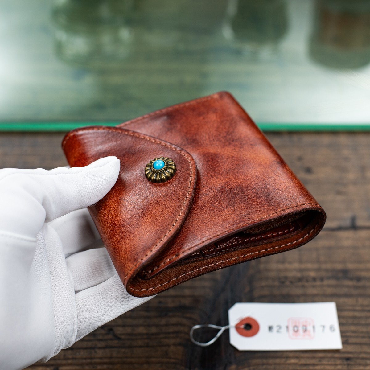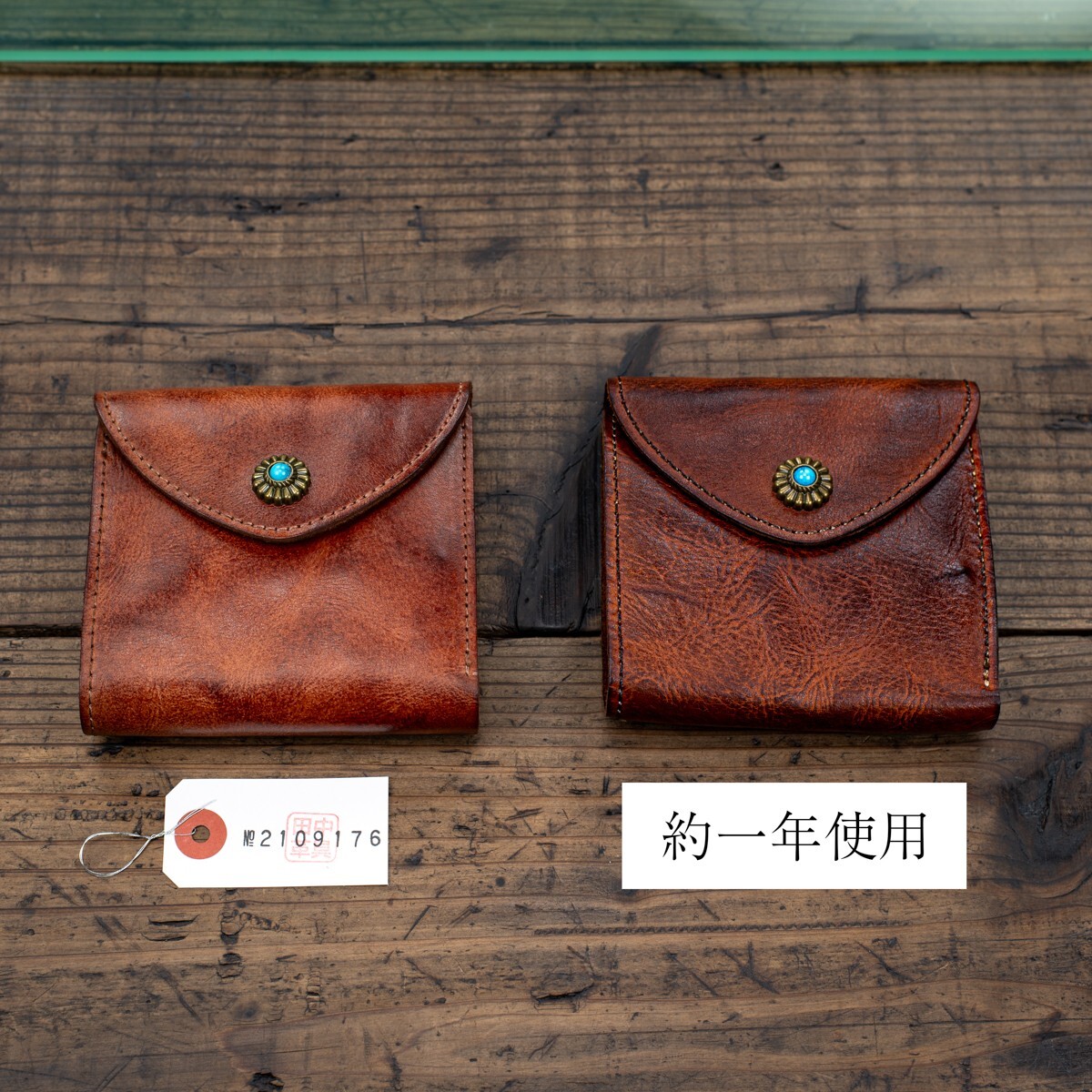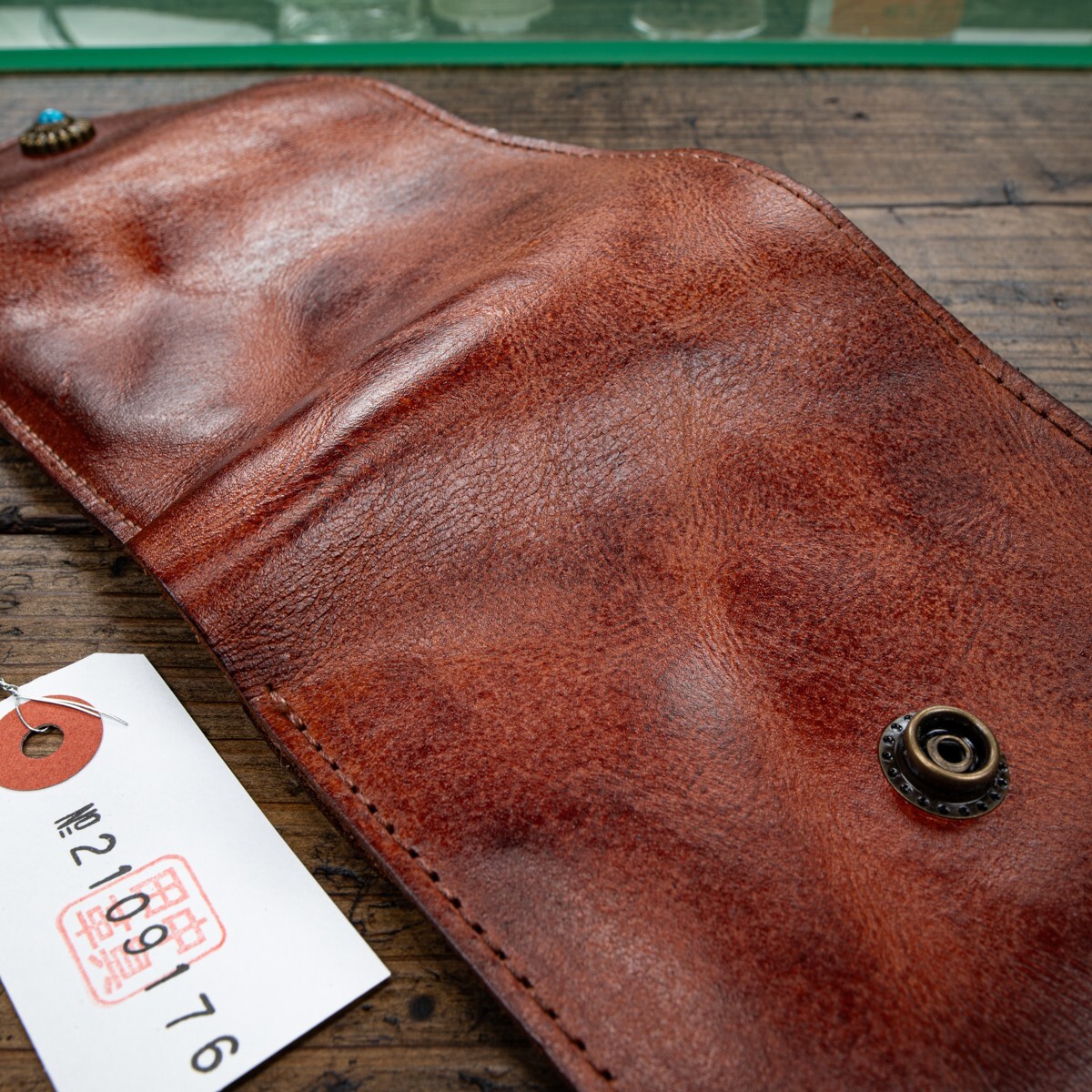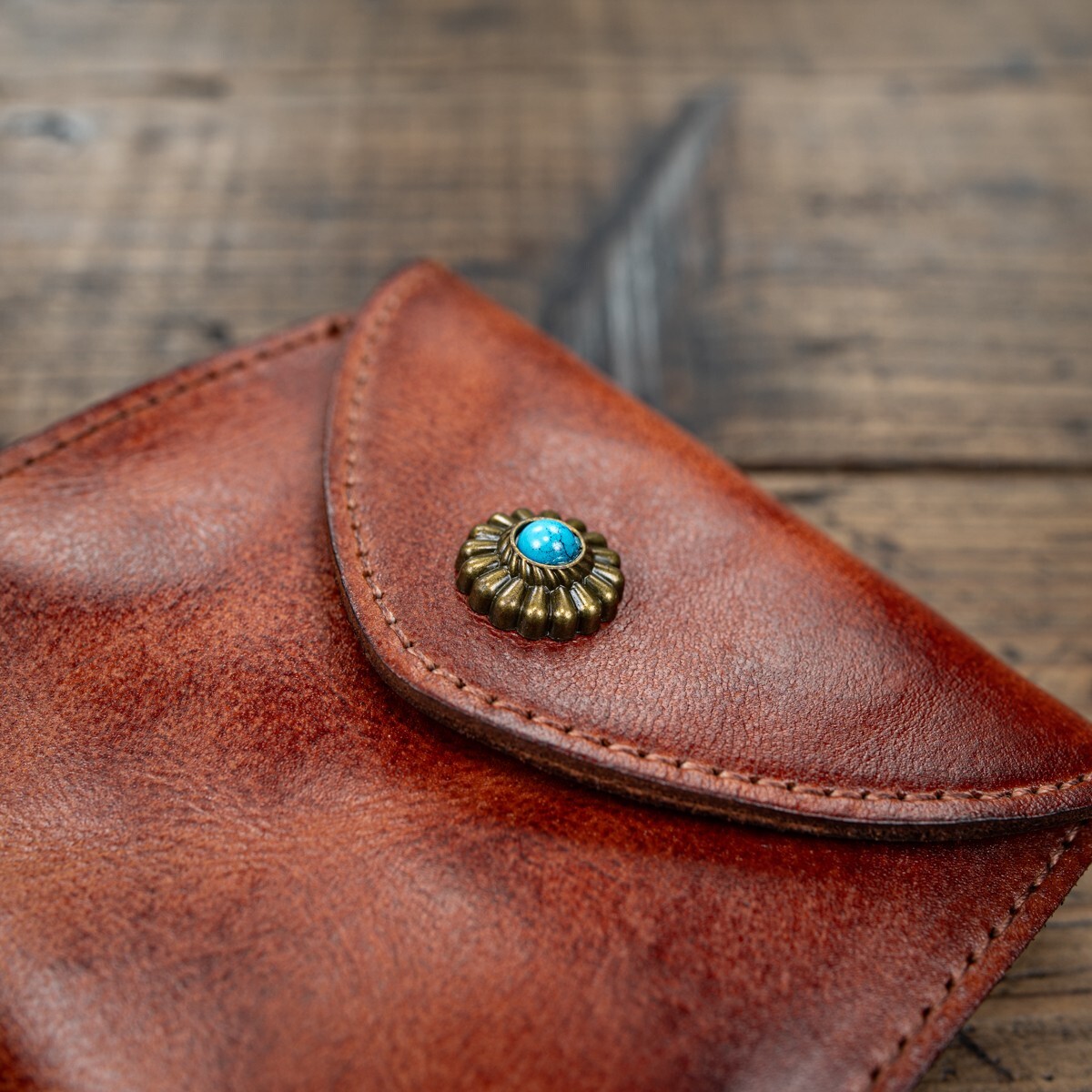 白銅製のコンチョにはターコイズがあしらわれており、さりげないアクセントになっています。特別な手入れは必要なく、レザーとともに経年変化を楽しめます。