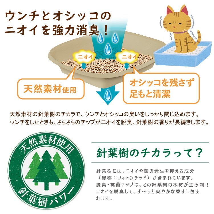 | 商品説明 | 猫ちゃん想い設計。猫ちゃんの快適も、清潔も、健康も。 ●脱臭・抗菌チップ(システムトイレ用猫砂) ●固まらないチップで、足もと清潔。 ●オシッコを残さず、さらさらをキープ。 ●猫ちゃんが直接触れるチップには天然の針葉樹を使用し、香料や抗菌剤を使用していません。 == 粒の大きさ/目安 == ・極小の粒 ・直径:約3mm ・細かい砂が好きな猫ちゃんに♪ == 特徴 == ●ウンチとオシッコのニオイを強力消臭! 天然素材の針葉樹のチカラで、ウンチとオシッコの臭いをしっかり閉じ込めます。 ウンチをしたときも、さらさらのチップがニオイを脱臭、針葉樹の香りが長続きします。 ▽「針葉樹のチカラ」って? 針葉樹には、ニオイや菌の発生を抑える成分が含まれています。 脱臭・抗菌チップは、この針葉樹の木材が主原料!ニオイを脱臭してず~っと爽やかな香りに包まれます。 ●おそうじラクラク チップはオシッコで固まらないから、取り除く手間なし。 (1箱 1cs まとめ買い ケース買い ケース購入 ケース販売 ) ■品名:ニャンとも清潔トイレ ■脱臭・抗菌チップ:極小の粒 ■サイズ:直径/約3mm ■内容量:2.5Lx6個入 ■用途:猫システムトイレ用砂(木質タイプ) ■材質:木材、はっ水剤、脱臭剤 ■処理方法:天然素材の木材を使用しているので、燃えるゴミとして処理できます。 ※ただし、自治体により廃棄物の分類が異なる場合があるので、お住いの地域のルールに従ってください ■使用期間の目安 ・愛猫1頭の場合:2.5Lで約1.5ケ月 ・愛猫2頭の場合:2.5Lで約3週間 ※愛猫の尿量は、体重や季節、年齢等によって変化します。チップの補充量は、愛猫の数や尿量、お使いのトイレの大きさによって調整してください。 ※チップは木材を主原料にしているため、木材の産地や季節などで若干ニオイや色が変わる場合がありますが、品質上問題ありません。 ※各社のシステムトイレ用トレーでもお使いいただけます。 ※ニャンとも清潔トイレは、チップ(砂)を通過しても、尿の成分に影響を与えません。 ※仕様は予告なく変更する場合があります。実際の商品のデザイン、色、仕様が一部異なる場合がございます。 1ケース/1箱/1cs/まとめ買い/ケース買い/ケース購入/ケース販売 |