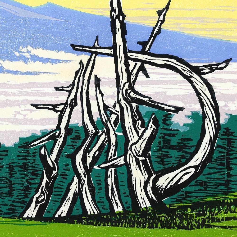 中西俊佳(1934年松山市生まれ)は、1957年に大宮昇に師事して版画を始め、以後長年にわたり愛媛の版画界を牽引してきた作家です。1972年に愛媛県美術会(県展)審査員に推進され、1988年まで連続して務めました。1974年には愛媛県版画研究会を再興し、1976年には第22回一陽展に入選して以後連続出品、同年に愛媛版画協会を結成して事務局長を務めました。1979年に松山そごうで個展を開催し、1988年には愛媛一陽版画会を設立して会長に就任、毎年展覧会を開催しています。1991年に一陽会会員、1992年に日本美術家連盟会員、1993年には第39回一陽会審査員を務めました。現在は一陽会会員(審査委員)をはじめ、愛媛県美術会常任評議員、松山市美術展運営委員など要職を歴任し、個展は松山7回、東京2回開催、作品は愛媛県立美術館、サンパーク美術館に収蔵されています。