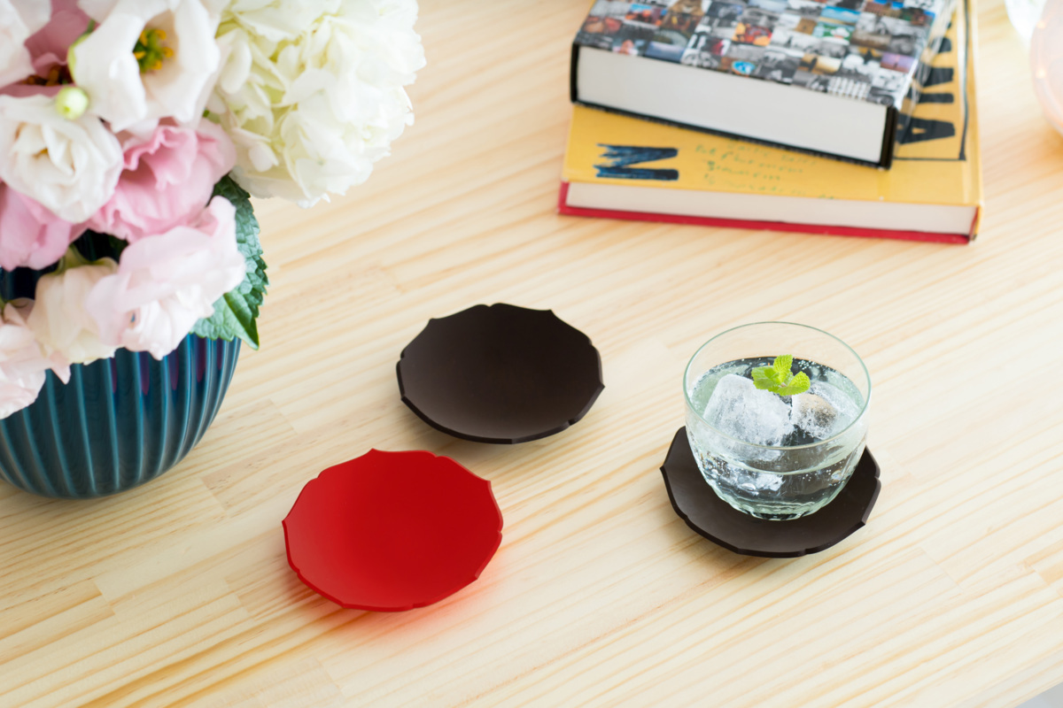滴る水をどんどん吸い取る、日本の伝統的な造形・稜花をモチーフにした超吸水素材のコースター。