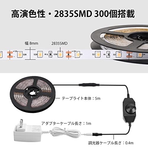 Lepro LEDテープライト ストリップライト 昼光色 6000k 無段階調光 ledテープ 5m 薄型 切断可能 取付簡単 SMD2835 300LED高輝度 正面発光 間接照明 非防水 室内・店内装飾 ledライト