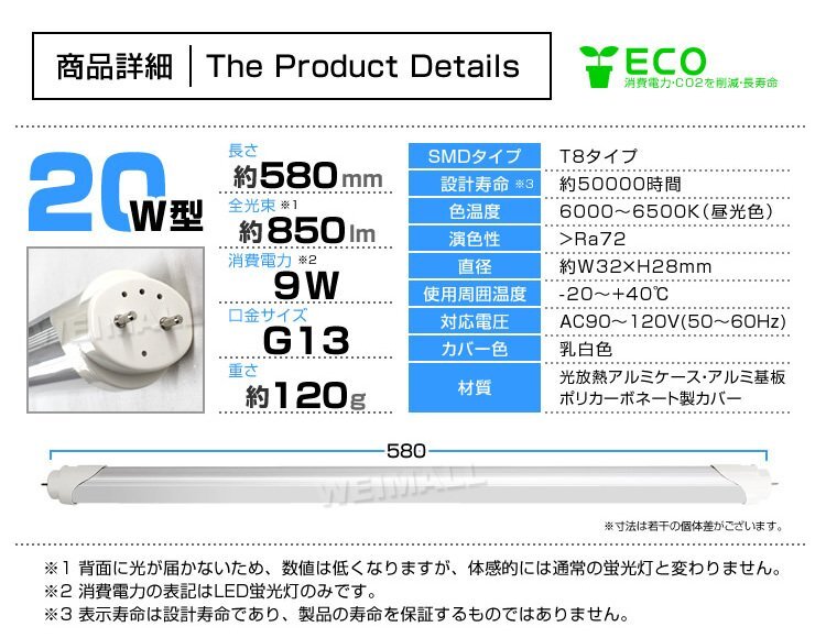 高性能高輝度LED(SMD)を使用!驚異的な明るさを実現! 20W形 直管LED蛍光灯です。 従来のLED蛍光灯よりも明るい! 従来蛍光灯に比べ、約60%消費電力削減! 工事無しで簡単取り付け可能! 今までネックになっていた配線工事を必要としないタイプです。 ◇当店のLED蛍光灯の特徴◇ 低消費電力、省エネで電気料金を大幅削減。 放熱部はアルミニウム合金製で、放熱性が更に向上、軽量化。 本体部はポリカーボネート樹脂+合金製で、割落・飛散しにくい。 【仕様】 電源:AC90~120V 50/60Hz 消費電力:9W SMDタイプ:T8 色温度:6000K~6500K 光束:850lm 使用温度条件:-20~40度 全長:580mm 直径:約28mm 重量:120g 口金:G13 カバー:ホワイト 寿命:50000時間 (LED蛍光灯 20W 直管LED蛍光灯 昼光色 58cm 580mm SMD 蛍光灯 工事不要 節電 省エネ コスト削減 LED 蛍光灯 直管 直管蛍光灯 20W形 20型 20形 天井照明 オフィス 照明器具 まとめ買い 部屋 リビング 寝室 照明 人気 おすすめ) |