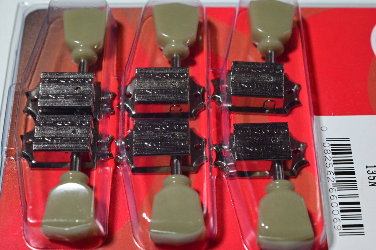 世界的に有名なGROVERから製造されるクルーソンスタイルの3対3配置 ギター用ペグ。135シリーズはナット締めタイプです。ニッケルパーツとプラスチック製ペグボタン、定番のデザインとなっています。