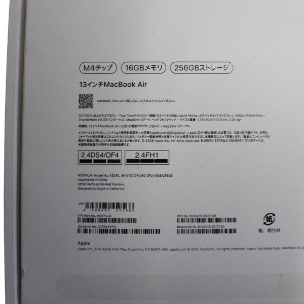 | 商品名 | Mac Book Air 13.6インチ M4 16GBメモリ 256GBストレージ |