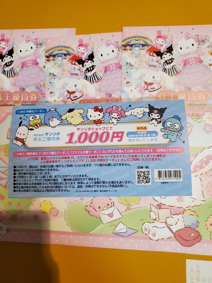 サンリオ株主優待券 最新 3枚プラス1000円割引クーポン1枚