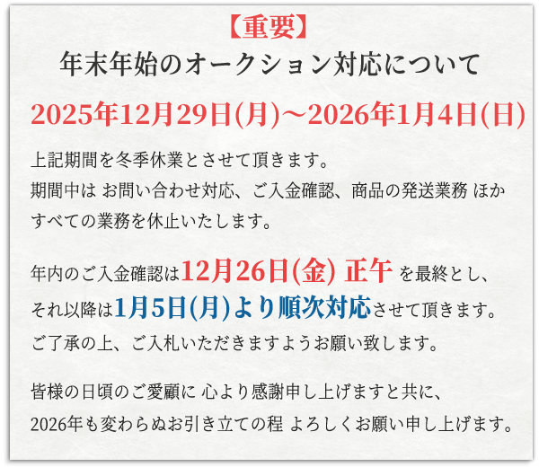 Ⅲ.一旦成功中标,您必须全额支付该拍品(成交价+消费税+银行转账费+日本邮费+代购费)。