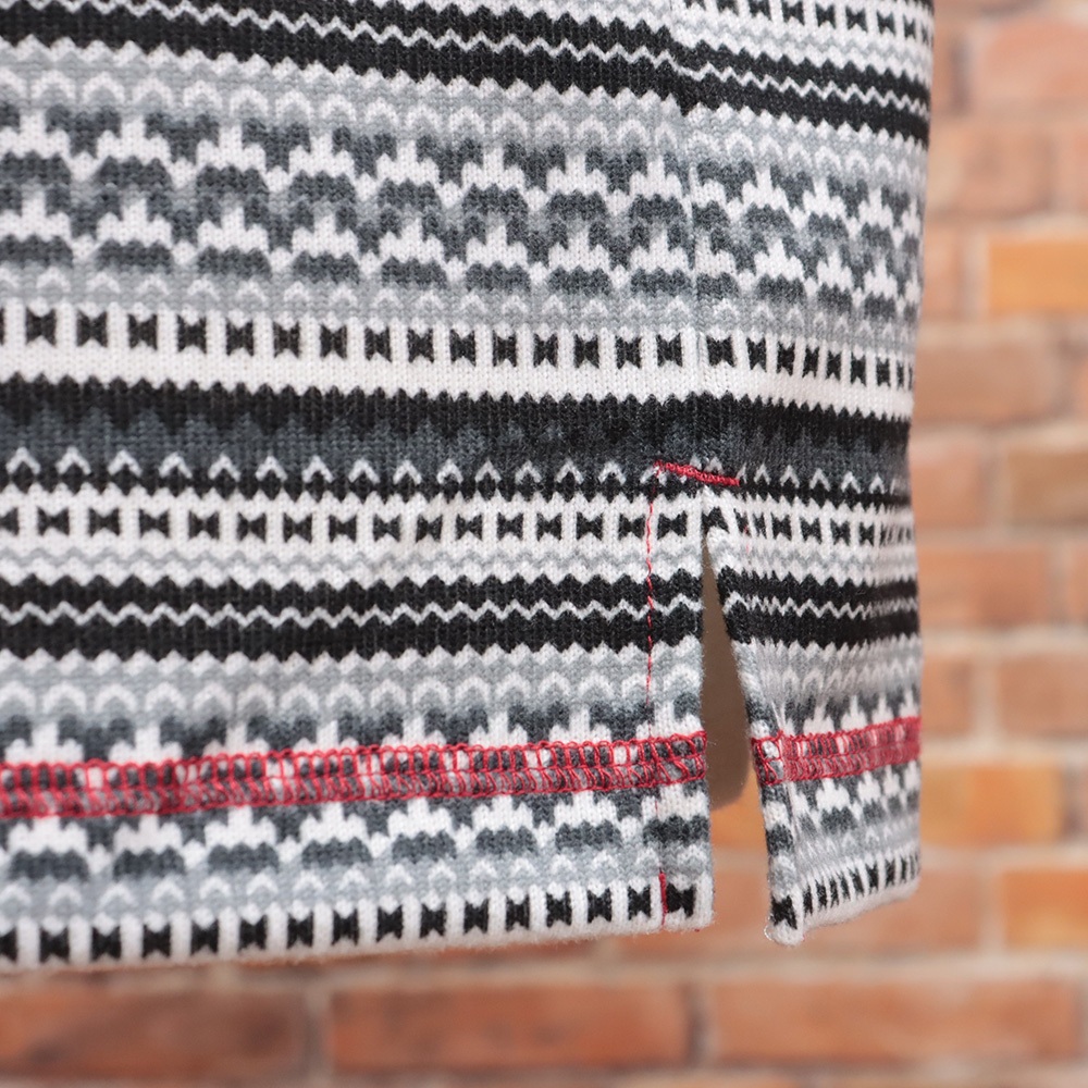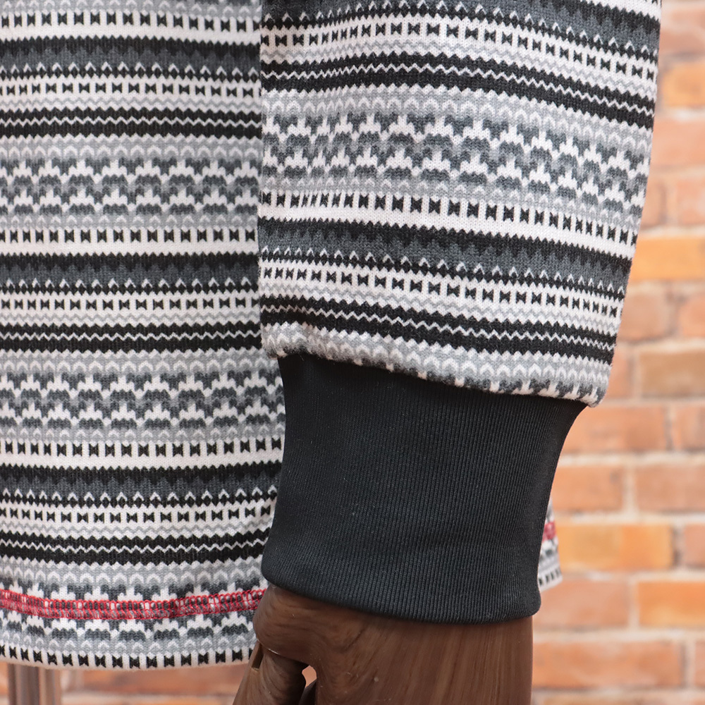 シックな配色の総柄に、ボタンとステッチの配色、更には袖口のリブがアクセントになった、大人の遊び心あふれる仕立て。一枚で着るのはもちろん、ジャケットやアウターのインナーとしても活躍する、大人の秋冬スタイルに取り入れやすい一着です。
