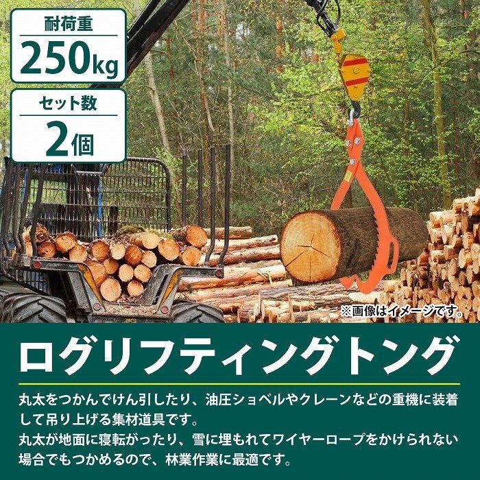 丸太をつかんでけん引したり、油圧ショベルやクレーンなどの重機に装着して吊り上げる集材道具です。