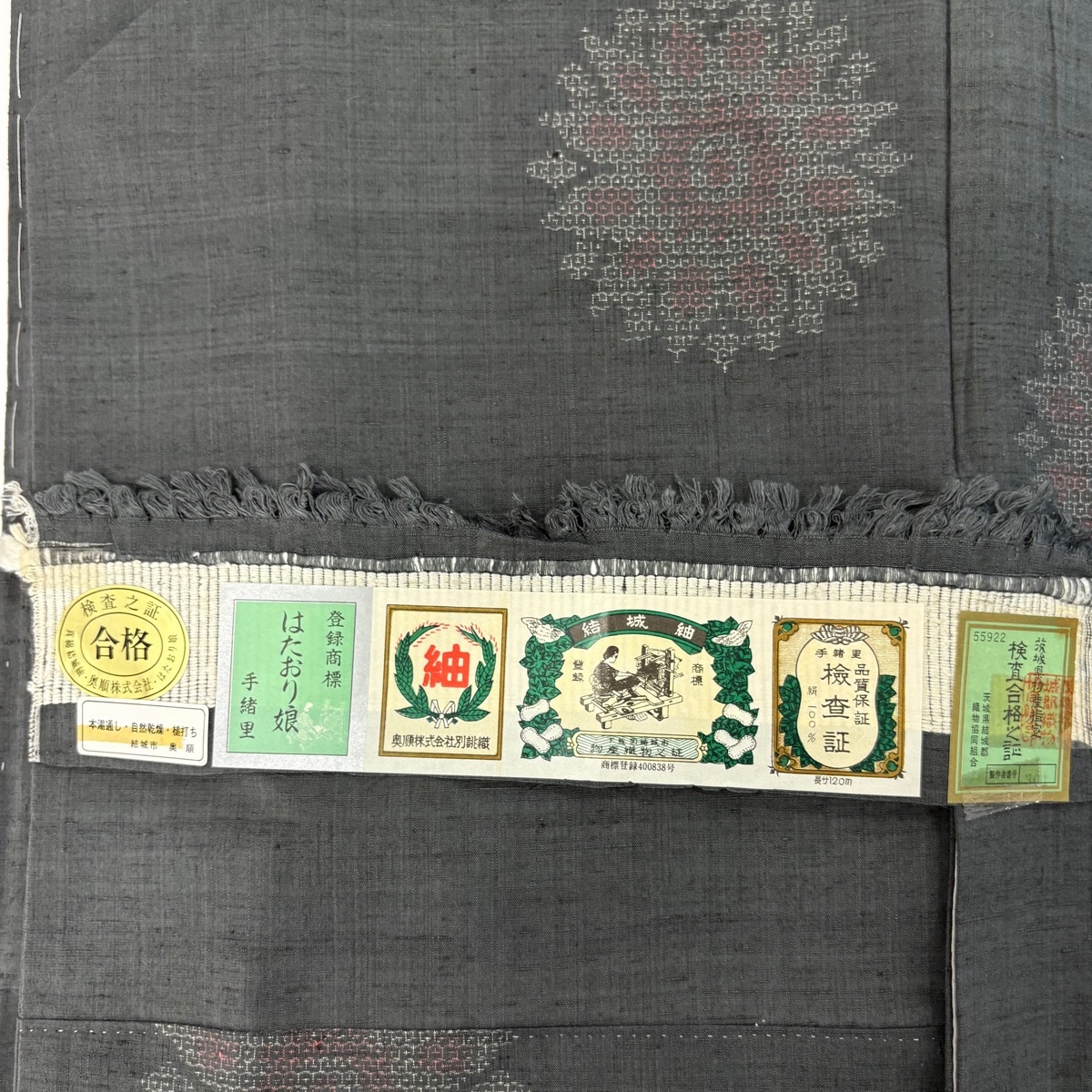 | 結城紬 美品 逸品 証紙 はたおり娘 花柄 亀甲絣 灰緑 袷 身丈156.5 裄丈65 M 正絹 【中古】 |