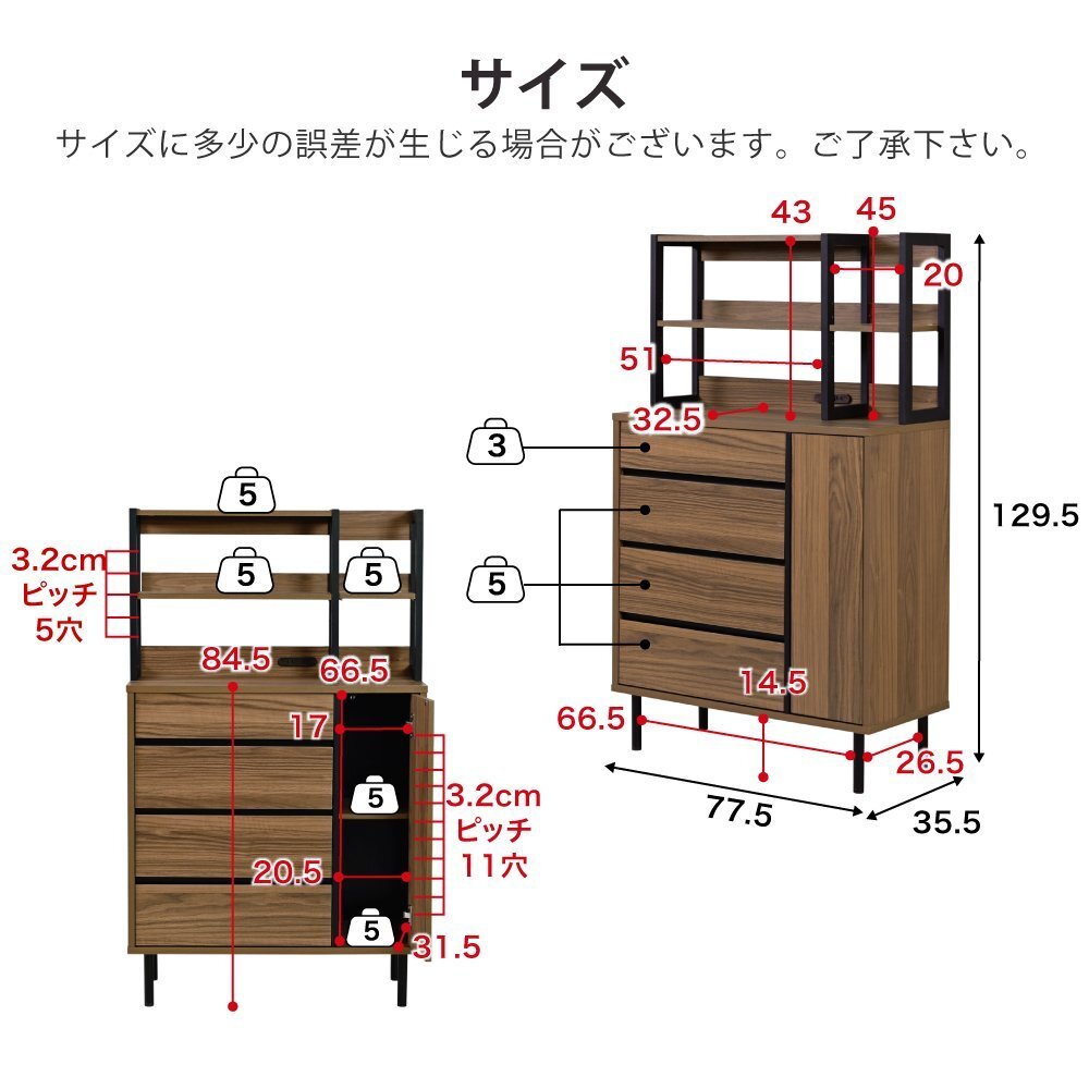 | 【カラー】 ブラウン×ブラック 【サイズ】 <外寸> 幅77.5×奥行35.5×高さ129.5cmcm <内寸> オープンラック左:幅51×奥行32.5×高さ43cm オープンラック右:幅20×奥行32.5×高さ45cm 引き出し1段目:幅46×奥行28.5×高さ5.5(有効:7)cm 引き出し2~3段目:幅46×奥行28.5×高さ7.5(有効:9)cm 引き出し4段目:幅46×奥行28.5×高さ7.5(有効:11)cm 扉内:幅17(有効:20.5)×奥行31.5×高さ66.5cm 脚間:幅66.5×奥行26.5×高さ14.5cm 【材質】 本体:プリント紙化粧合板 脚:スチール(粉体塗装) 【耐荷重】 チェスト上:(約)10kg以下 引き出し1段目:(約)3kg以下 引き出し2~4段目:(約)5kg以下 可動棚:各(約)5kg以下 固定棚:各(約)5kg以下 【生産国】 中国 【梱包】2梱包でお届けします。 2-1 サイズ:85.9×38.6×25cm、重量:25kg 2-2 サイズ:60×23.5×13cm、重量:2.3kg 【その他】 ・背面化粧あり ・可動棚:各1枚(合計3枚) ・アジャスター付き ・合計1500Wの2口コンセント付き(コード長さ180cm) 【組み立て品】 お客様による組み立てが必要です。 【ご注意】 ・サイズ、重量は概算です。 ・商品カラーはご使用のモニターによって実際の明るさや色と異なって見える場合がございます。 |