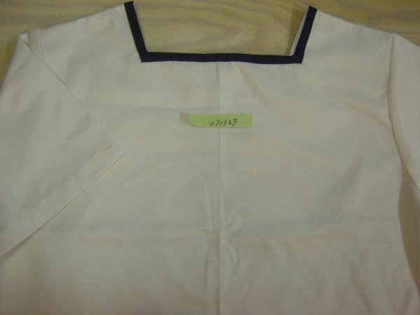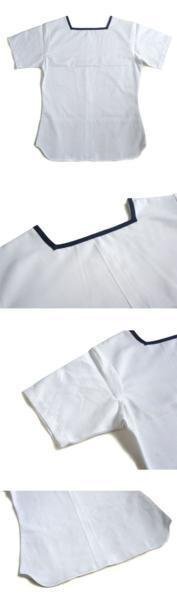 1枚目の写真は流用です。 未使用品ですが、白ですので若干の保管時の汚れがあります。イギリス海軍のせーらーTシャツでなかなかレアな一品になります。 素材はおそらく綿ポリで首周りだけネイビーの縁取りがされています。前後の違いのないデザインです。 サイズ表示は96で丈70cm、胸囲106センチ、肩幅44cm程度。 クロネコネコポス便200円でお送りいたします、落札価格にプラスでお願いいたします。