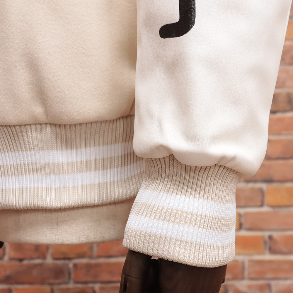 クラシックなスタジャンのデザインをベースに、現代的なストリート感を融合させた中綿スタジャン。身頃には温かみのあるメルトンを、袖にはリアルな質感のシンセティックレザーを採用。異素材の組み合わせが立体的な表情を生み出しています。裏側は中綿入りのダイヤキルティングで総裏仕立てとなっており、寒い日でも快適に着用できる暖かさを確保しています。
