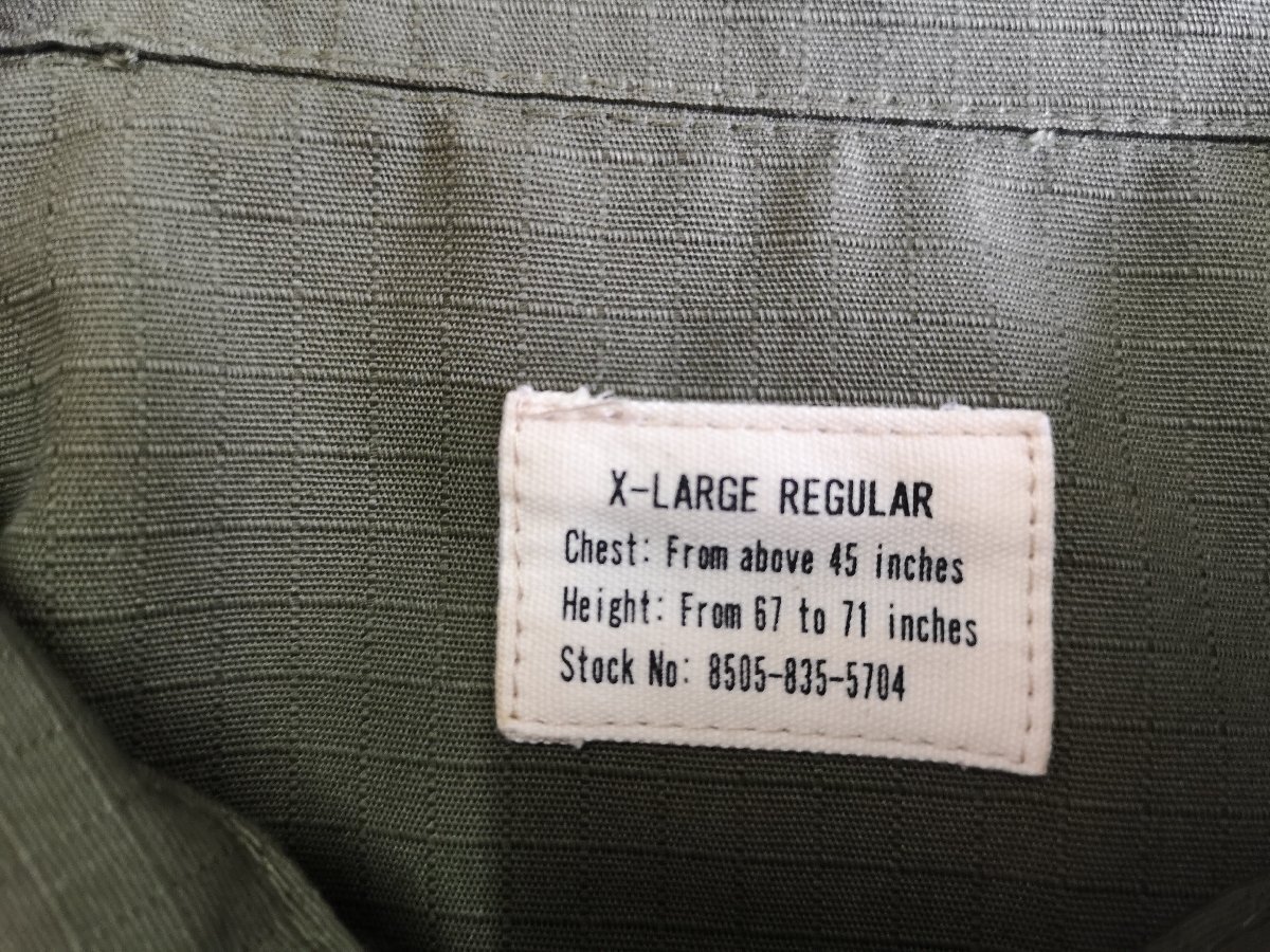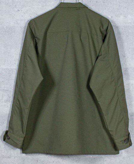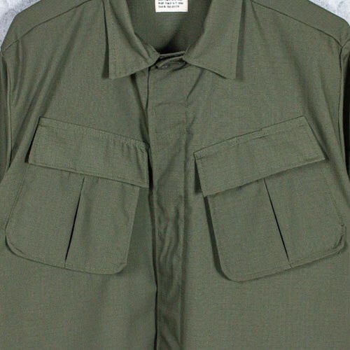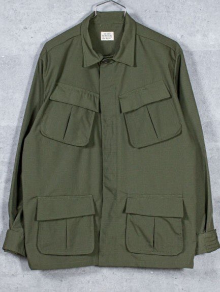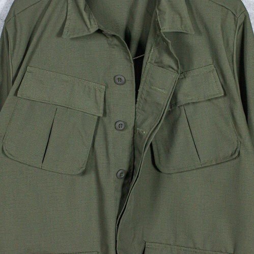1962年に採用されたジャングルファティーグの歴史は長く、大きく分けて4度の改良を経ています。当時、開発に当たりM42パラトルーパージャケット、パンツが参考にされており、ジャケットは4個、パンツは6個のポケットを持つスタイルでした。特徴のある斜めに配置された胸ポケットは、戦闘で体を伏せた場合に物を取り出しやすいように工夫されました。また、ポプリン生地は従来のコットン生地より軽量で速乾性に優れていました。 ジャングルファティーグは、当初採用されていた露出されたボタンやエポレットは廃止され、ポプリン生地は鉤裂き防止加工が施されたリップストップ生地に変更されました。実戦のなかで改良が加えられ、完成度の高くなったジャングルファティーグは後のBDUに大きな影響を与え、4ポケットジャケット、6ポケットパンツのスタイルは、1990年代末まで戦闘服の基本形となりました。 このレプリカは最も完成度の高い最終(4th)モデル元に、素材も同じコットンポプリンのリップストップ仕様で製作しており、細かなディテールまでも忠実に再現しております。 素材:コットンポプリン100%リップストップ サイズ表記XL 丈77cm 身幅69cm 肩幅52cm 袖65cm 程度となります。 沖縄離島を除く全国500円でお送りいたします、落札価格にプラスでお願いいたします。