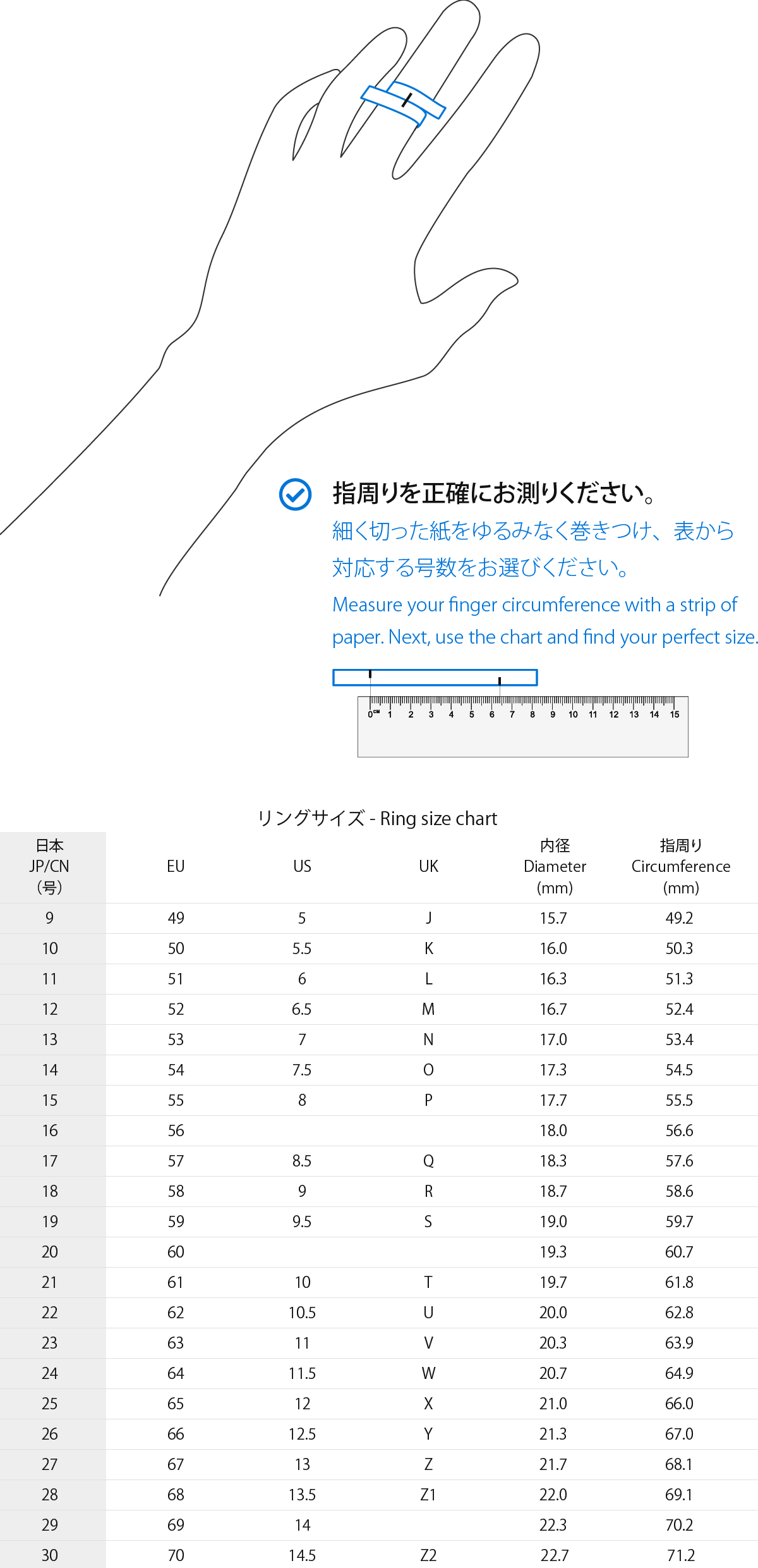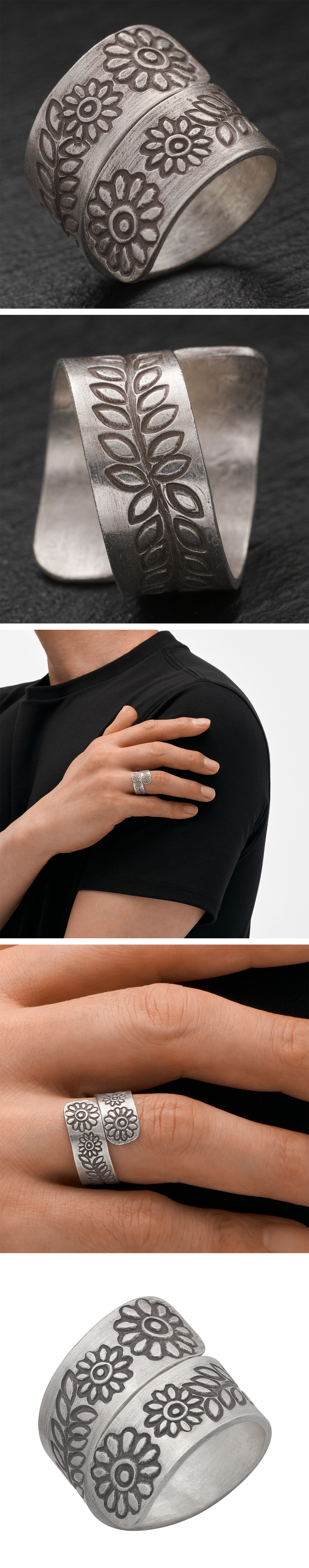 見た目よりもずっと軽やかでフィットする スパイラルの両端に大きな花の刻印をあしらい、植物文様が端から端までぐるりと囲んだ平打ちのカレンシルバーリングです。 厚さわずか0.8mmに伸ばしたスパイラルのフォルムは見た目よりもずっと軽やか。 少しの力で大きさを変えられるので着け心地も上々。 指元を華やかにし、心も華やぐアイテムです。 メンズ/レディース兼用。フリーサイズ。純度の高い銀を使用しているので柔らかく、サイズを自由に変えられるのが特長です。 カレン族の手仕事によるシルバーリング カレンシルバーはタイの山岳民族カレン族の手仕事によって、伝統的手法で丹念に作られます。 マットな質感が特徴で、刻印の一つ一つが異なる表情を持ち、素朴なぬくもりが心に響きます。 研磨されていない温かみのある質感、無骨で荒削りな形状。 これらの味わいがカレンシルバーの持ち味であり、他のシルバーアクセサリーとは異なる個性となります。 自然と共存する彼らの作るものには、身近に暮らす動植物や生活道具などを象ったモチーフが多く見られます。 そこには自然を畏れ敬うアニミズムの思想が流れています。 カレンシルバーの銀純度 シルバーはやわらかい金属です。 純銀では傷がつきやすく装飾品に向かないため、耐久性や強度を補う目的で銅などの金属を混ぜ合わせます。 一般的な装飾品は銀92.5%+銅7.5%の合金が用いられます。 これはスターリングシルバー(Sterling Silver)、SV925と呼ばれます。 カレンシルバーは銀95%+銅5%のSV950が用いられます。 SV925は昔ながらの手仕事には固すぎるためです。 ※カレンシルバー、天然石、アンティークビーズは、それぞれの特性上、刻印や形、色合いや風合い、小さなキズなど個体差があります。素材や製法の特性としてご理解ください。 ※入荷時期によって色味、形状、表情に個体差があったり、若干の違いが生じる場合があります。 ※色はできる限り正確に表現するよう努めていますが、モニターやモバイル機器の設定、撮影時の照明、写真の拡大などの違いにより、実物よりも大きく太く、実際の色と異なって見える場合があります。 キーワード リング 植物 【素材】 SV950(銀純度95%) 【寸法】 直径約20mm×幅約16mm×厚さ約1mm 約6g 【サイズ】 フリーサイズ 9号~27号で調整可 掲載写真は11号 【生産国】 タイ ![]() サイズガイド