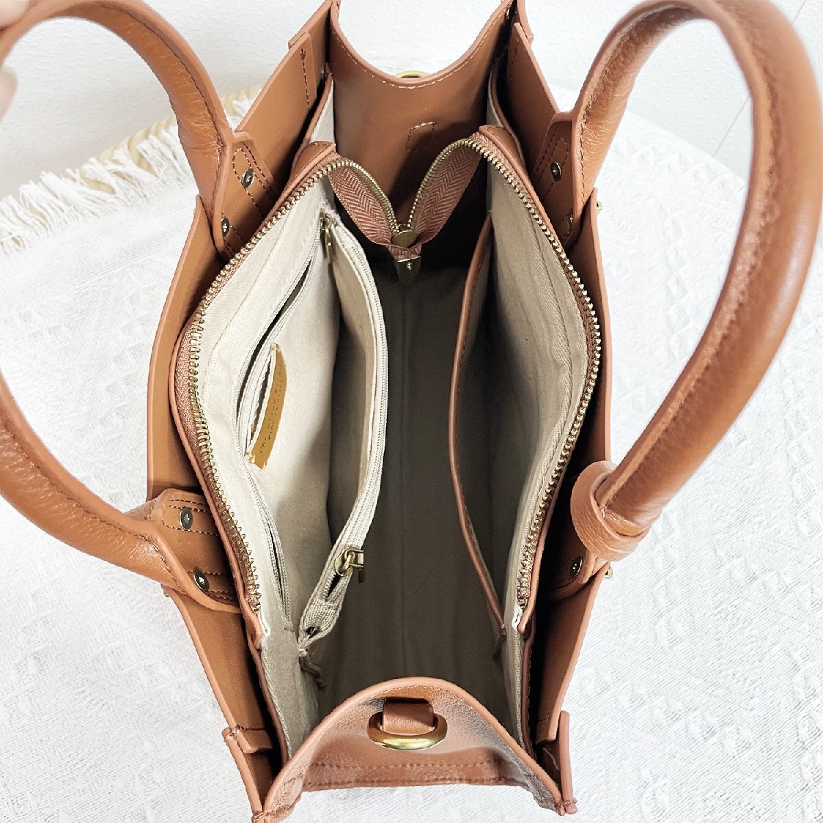 本体は高品質牛革レザーを使用しており、柔らかでシボが美しく、女性のニーズにしっかり応えていると思います。マットな質感のレザーで高級感がさらにアップ!使えば使うほど味が出る本革の魅力を堪能下さい。しかも、本革で汚れにくく、耐久性に優れているので長く愛用できます。