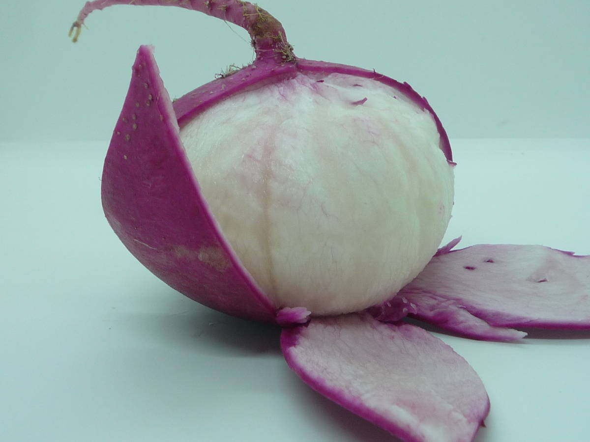 こちらは皮が手でむけるサラダカブになります。可愛らしい、カブです。まき時7月から9月、収穫8月から11月