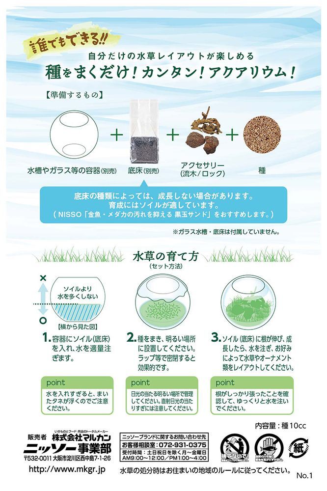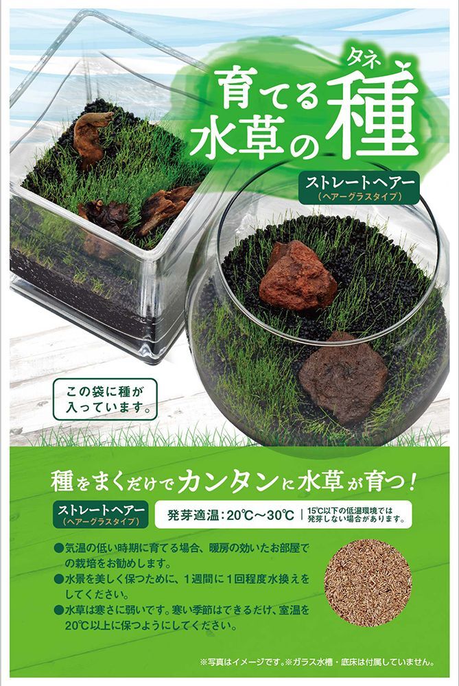 <水草の育て方(セット方法)> 1)容器にソイル(底床)を入れ、水を適量注ぎます。 (水を入れすぎるとまいたタネが浮くのでご注意ください。) 2)種をまき、明るい場所に設置してください。ラップ等で密閉すると効果的です。 (日光の当たる明るい場所で管理してください。直射日光の当たりすぎには注意してください。) 3)ソイル(底床)に根が伸び成長したら、水を注ぎお好みによって水草やオーナメント類をレイアウトしてください。 (根がしっかり張ったことを確認して、ゆっくりと水を注いでください。)