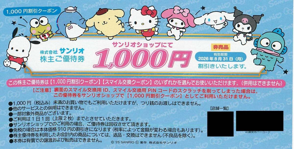 最新2026.8.31迄 サンリオ 株主優待 【1000円割引】or【5000スマイル交換】クーポン 1枚 サンリオショップ/Sanrio+