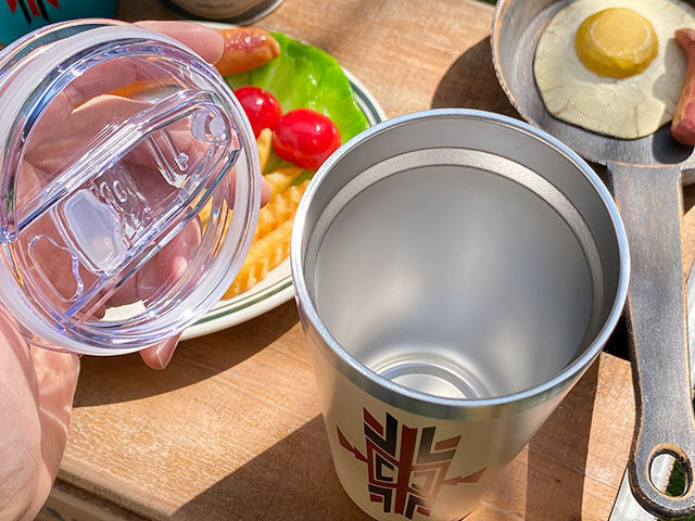 シリコンパッキン付きのフタが付いてるので持ち運びの時も便利だし、普段はフタを外して開けっぱなしで快適にタンブラーとして使えるんですよ!