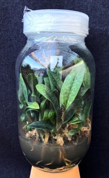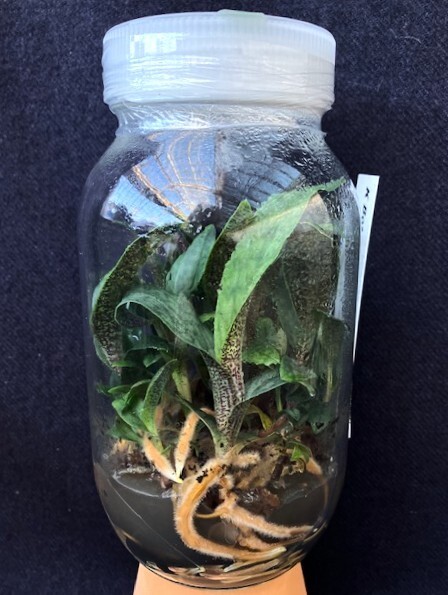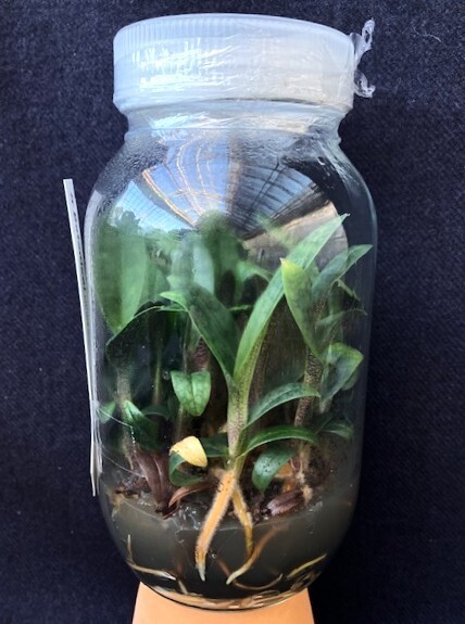 今年6月に販売したフラスコと同じ交配で、納品数が極端に少なかったので1本のみの販売となりましたが、追加のフラスコが極少量ではありますが納品されました。6月に販売したものと比べると苗がかなり大きく立派になっていてすぐに単鉢にあげれそうな苗です。(11月に出品したフラスコとは別のクロスです)