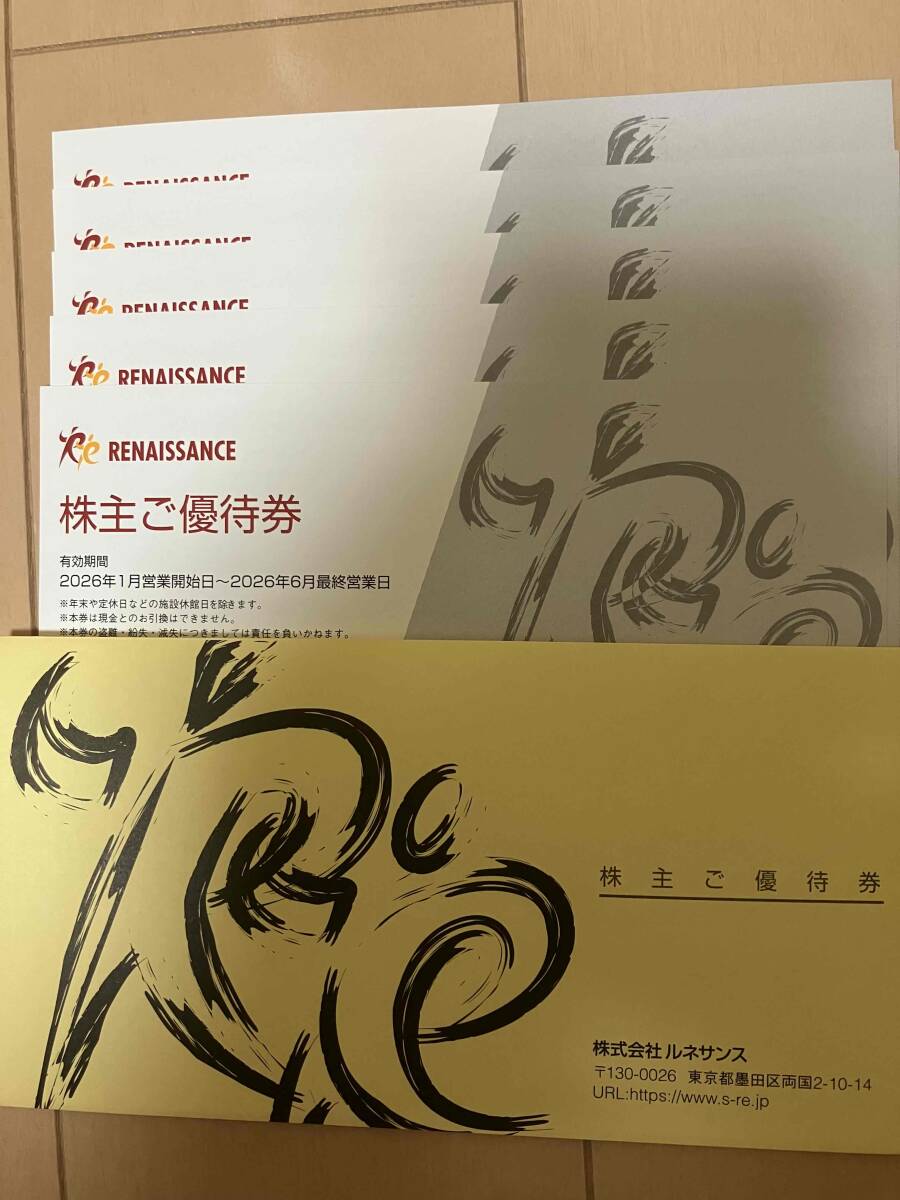 ルネサンスの株主ご優待券が5枚です。有効期間2026年1月営業開始日~2026年6月最終営業日迄です。
